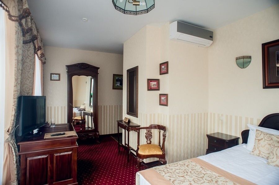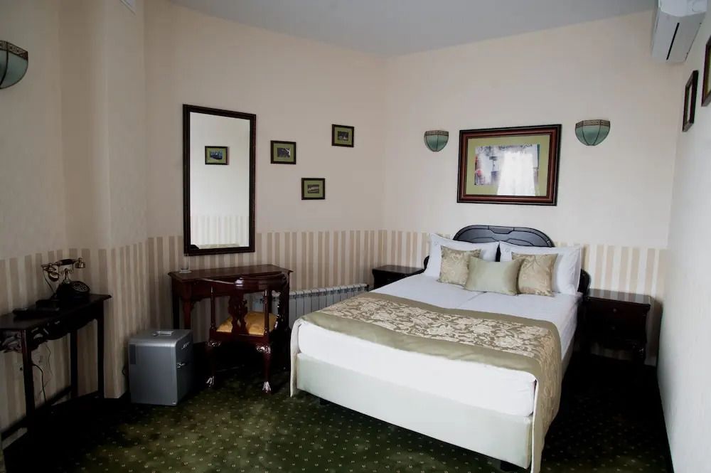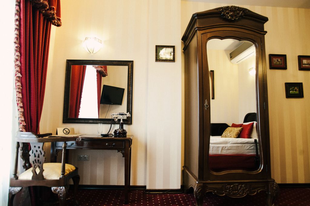 телевизор, Wi-Fi, телефон, холодильник, кондиционер, светильник, фен, электронные замки, ванна, санузел, водонагреватель, банные принадлежности, халаты, банные полотенца, тапочки, гигиенические средства, полутораспальная кровать, ортопедический матрас, тумбы, стулья, шкаф для одежды, вешалки, журнальный столик, письменный стол, зеркало, эксклюзивная мебель, свежая пресса, чайный набор, информационная карта, меню, сейф, минеральная вода, чайник, косметическое зеркало, питьевая вода, ковровое покрытие, меню подушек, набор для приготовления чая и кофе, услуги прачечной (платно), бутилированная вода, прачечная (за дополнительную плату), можно с питомцамиВ гостиничном номере