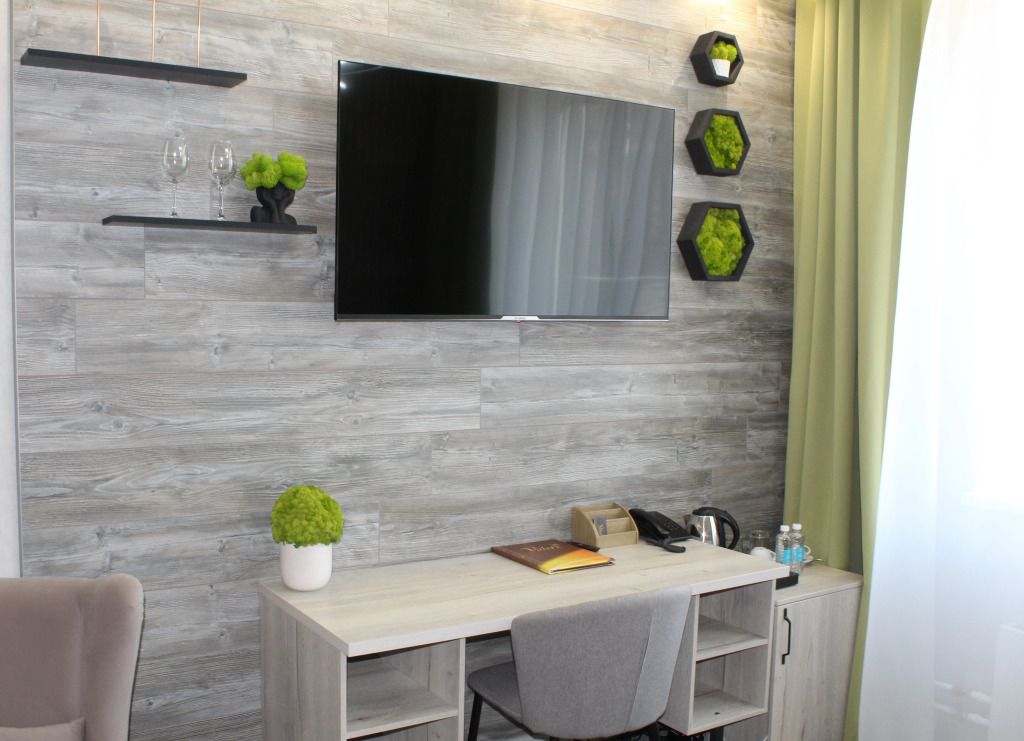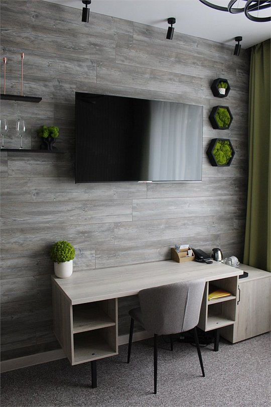 телевизор, кабельное телевидение, Wi-Fi, кондиционер, светильник, настольные лампы, фен, электронные замки, душевая кабина, санузел, водонагреватель, халаты, банные полотенца, тапочки, косметические средства, двуспальная кровать, тумбы, стулья, шкаф для одежды, гардеробная, вешалки, письменный стол, багажная тумба, зеркало, чайный набор, сейф, чайник, раковина, питьевая вода, ковровое покрытие, душ, стул, стол, тумба, туалетные средства, туалет, сплит-система, внутренний телефон, телевизор с плоским экраном, мини-холодильник, рабочий стол, можно с питомцамиВ гостиничном номере