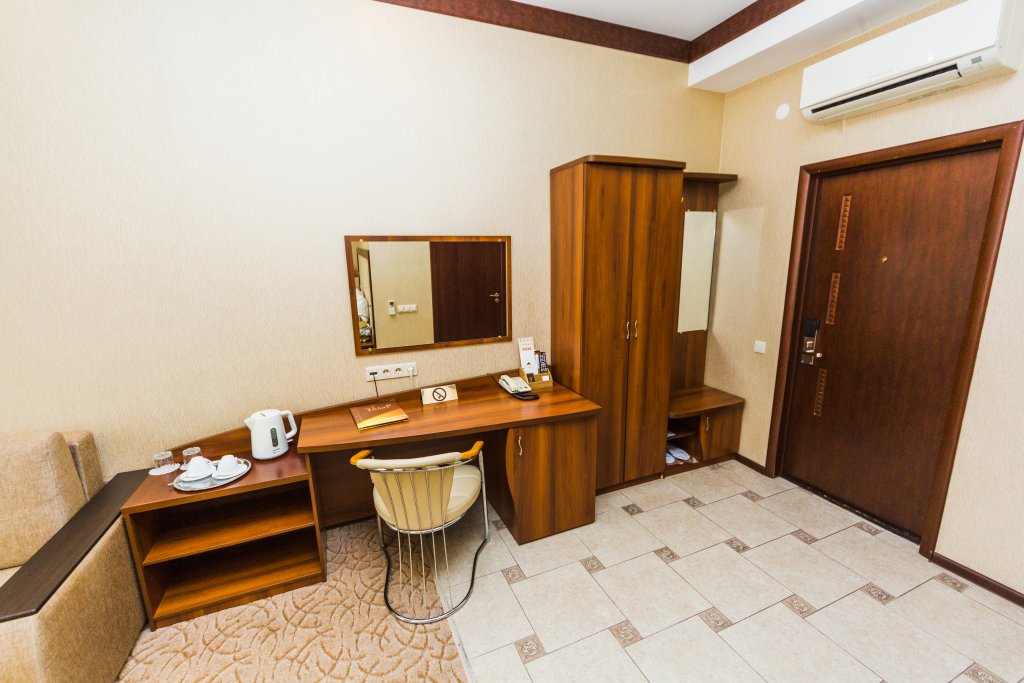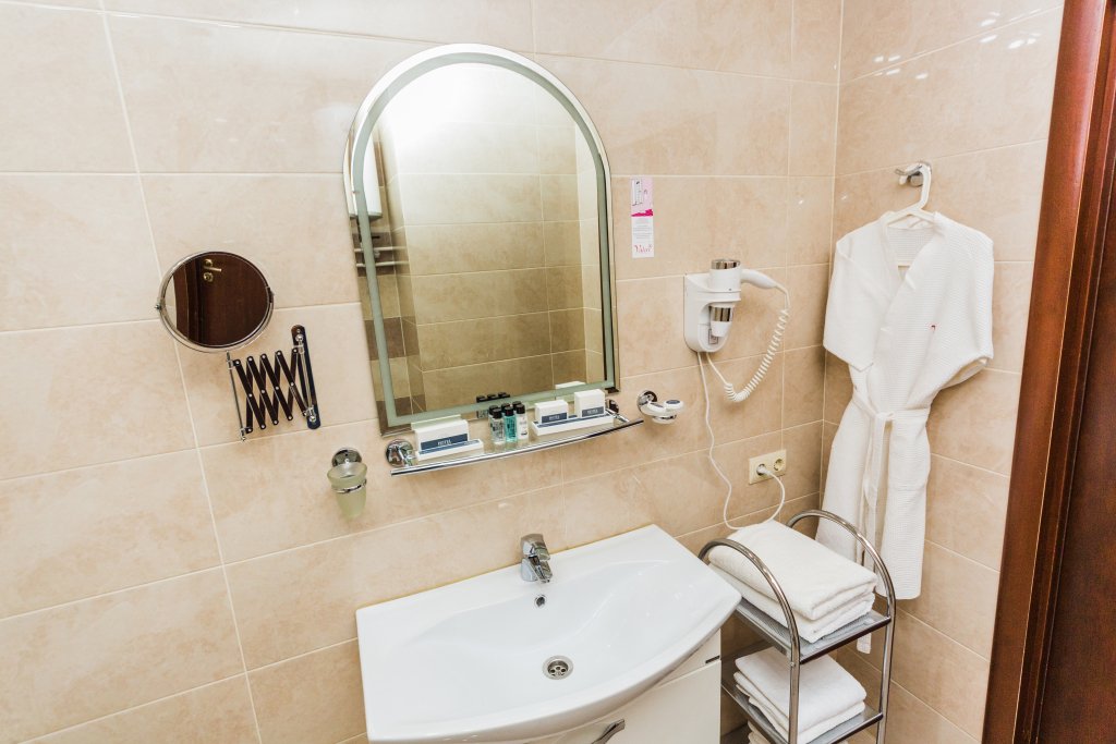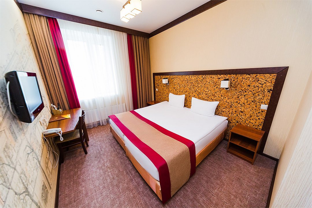 Путешествие с паройДа же не ожидали!Отель очень понравился! Номер брали двухместный на одну ночь без завтрака. Небольшой уютный номер. Очень чистый, ковролин на полу то же чистый. Кровати очень удобные, мягкие, чистые -- просто прелесть. Подушки отличные. К одеялу то же ни каких претензий. На окне есть москитная сетка, можно окошко открыть не боясь прилета насекомых. Есть маленький холодильничек, а в холодильнике отель предоставил небольшой "комплимент от отеля", что, как говориться, мелочь, а приятно). Вода питьевая есть в кулере на этаже. В номере есть две чашки, два стакана. Тапочки были, правда одна пара, но вторую мы просить не стали (приехали поздно, очень устали). Два халата. Полотенец полный комплект: два для рук, два для тела большого размера, два для тела меньшего размера, два для ног. Туалетные принадлежности: щетка и зубная паста, мыло, шапочка для душа, расческа, бритвенные принадлежности -- правда все в одном количестве на одного гостя, то ли горничная пожадничала, то ли так положено, но просить второй набор на второго гостя мы то же не стали -- ну не было необходимости, мы и этот то комплект не использовали, ну кроме мыла и шапочки для душа. Вся сантехника читая, но раковина, откровенно говоря, маленькая и коротенький кран, но ни чего, все что нужно можно сделать, приловчившись). Гель для душа и шампунь есть в диспенсерах, закрепленных в самой душевой кабине. Вода горячая подогревается в бойлере, бойлер большой и воды на двоих вполне хватило. Телевизор есть и каналов....очень много, ну просто удивили: и СТС, и ТВ 1000, и каких там только не было, я лично такое в отеле первый раз встретила. Персонал такой приветливый, да же охранник на стоянке. К стати, стоянка есть, небольшая и охраняется, машину загоняли за закрываемые ворота. Вход нашли сразу: охранник рассказал куда пройти. На ресепшене можно приобрести кофе (в стаканчике с собой за 100-120 руб.), есть американо, эспрессо, латте, капучино, и еще чай есть. В отельчике есть ресторан, но к сожалению нам не пришлось им воспользоваться. В отеле было тихо и спокойно, шум с улице не был слышен. В общем нам все понравилось!