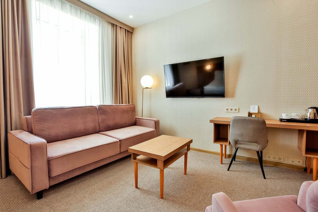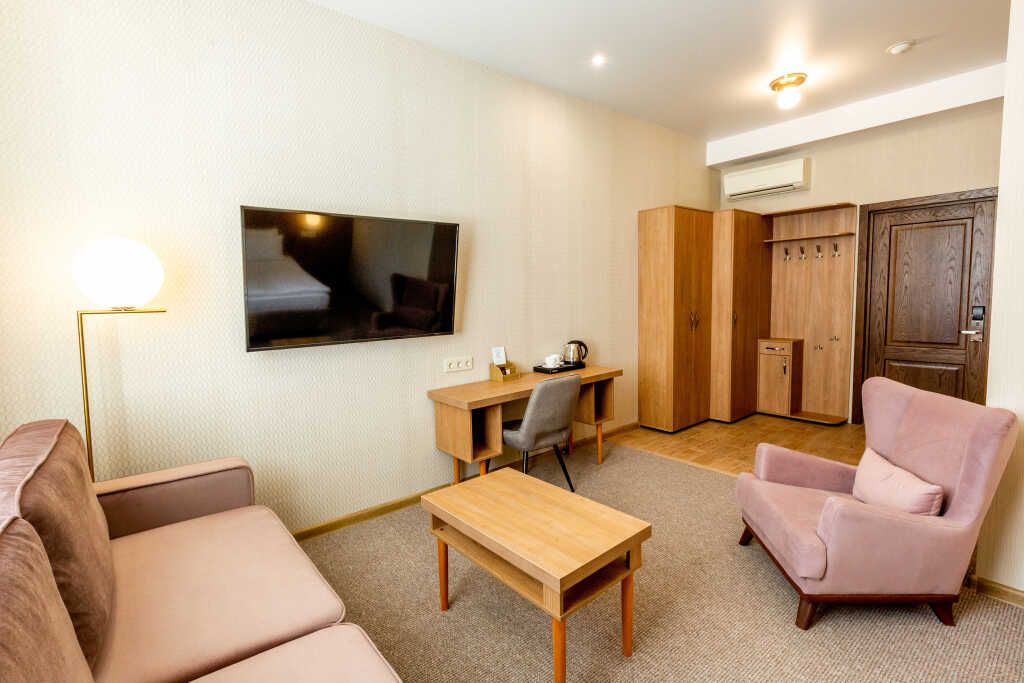 два телевизора, кабельное телевидение, Wi-Fi, интернет, телефон, холодильник, кондиционер, система климат-контроля, светильник, фен, система безопасности, электронные замки, ванная комната, ванна, водонагреватель, банные принадлежности, халаты, банные полотенца, тапочки, гигиенические средства, косметические средства, двуспальная кровать, кресла, шкаф для одежды, вешалки, журнальный столик, письменный стол, багажная тумба, зеркало, мини-бар, чайный набор, обслуживание номеров, информационная карта, меню, сейф, минеральная вода, чайник, унитаз, косметическое зеркало, гостиная зона, ковровое покрытие, вид на город, стаканы, стул, туалетный столик, туалетные средства, сплит-система, раскладной диван, внутренний телефон, телевизор с плоским экраном, мини-холодильник, можно с питомцамиВ гостиничном номере