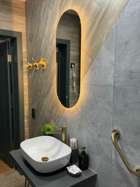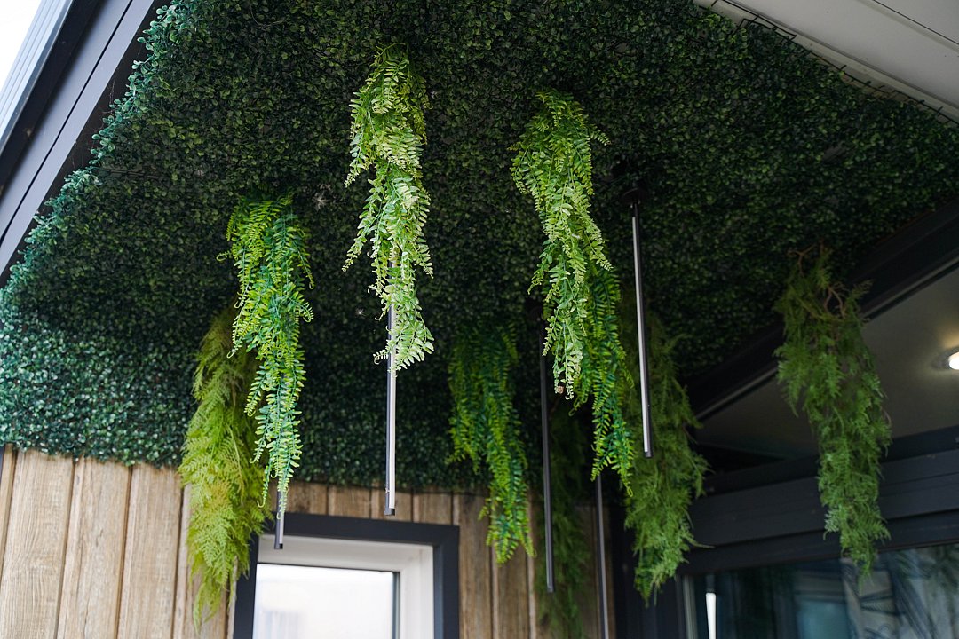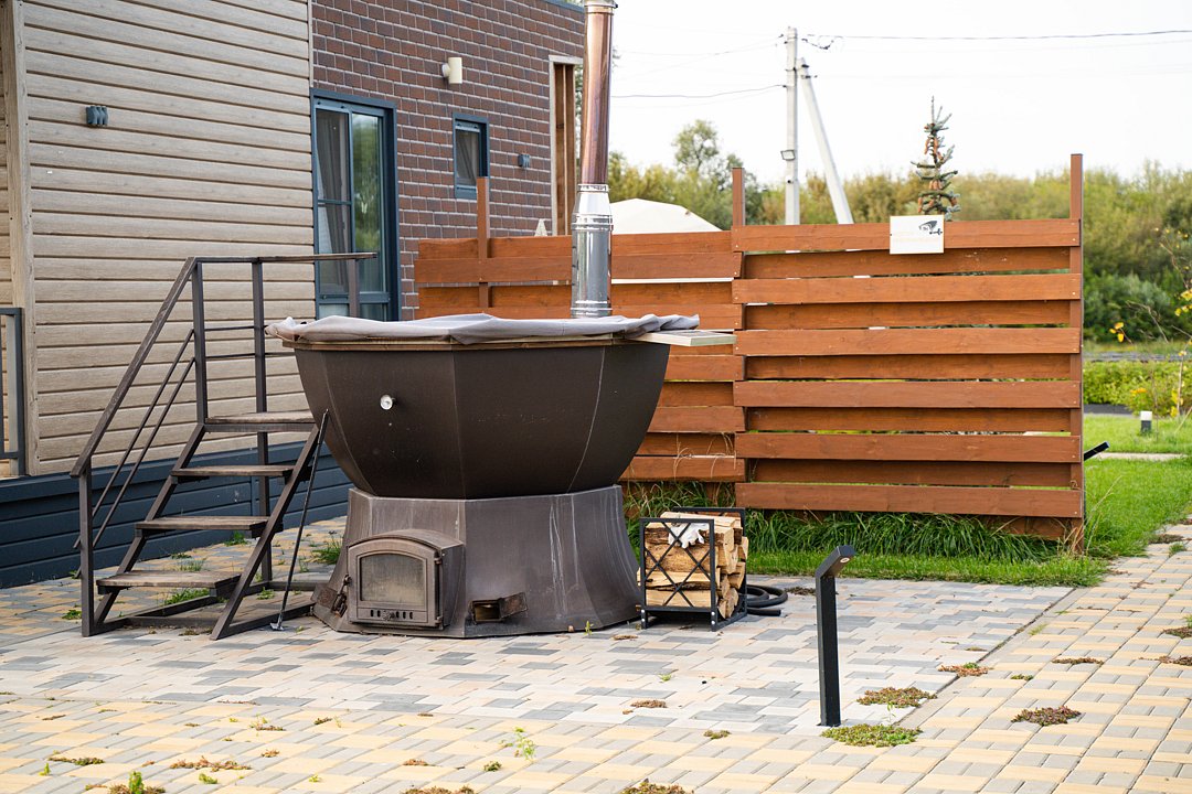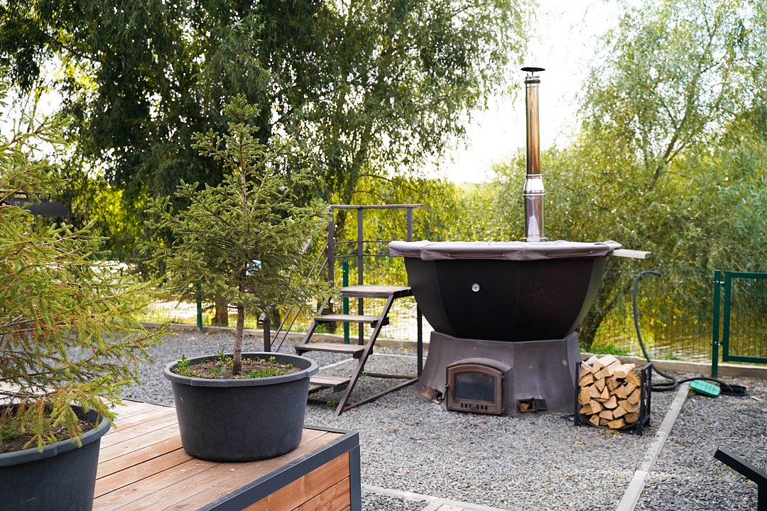 Парная двухъярусная с подсветкой, с ароматным панно из можжевельника, с термометром, с эфирными маслами, с деревянным банным тазиком и ковшом. Рядом с баней расположен Сибирский банный чан (оплачивается отдельно 5000 ₽) и мангал.