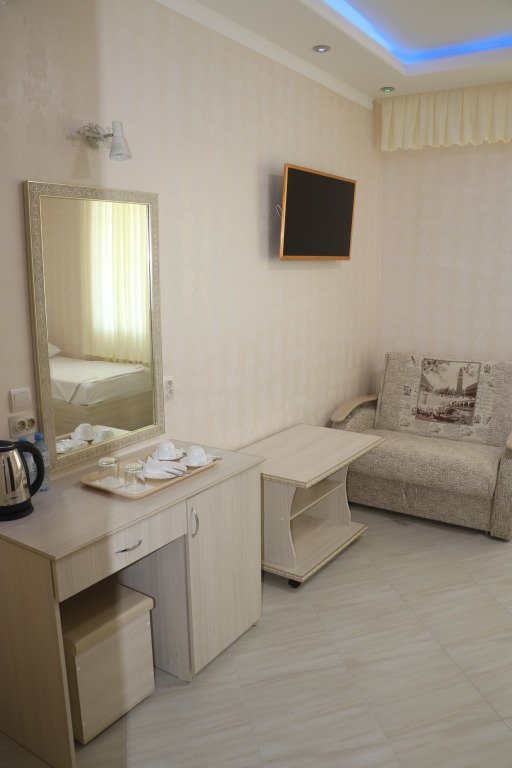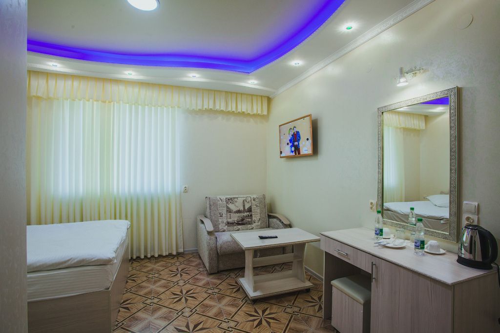 спутниковое телевидение, кабельное телевидение, Wi-Fi, холодильник, кондиционер, фен, будильник, утюг, ванная комната, санузел, банные полотенца, тапочки, гигиенические средства, две односпальные кровати, тумбы, шкаф для одежды, журнальный столик, зеркало, пуфики, звуконепроницаемые стены и окна, чайный набор, сейф, минеральная вода, чайник, унитаз, раковина, вид на город, стаканы, туалетный столик, туалетные средства, туалет, диван-кровать, раскладное кресло, телевизор с плоским экраномВ гостиничном номере