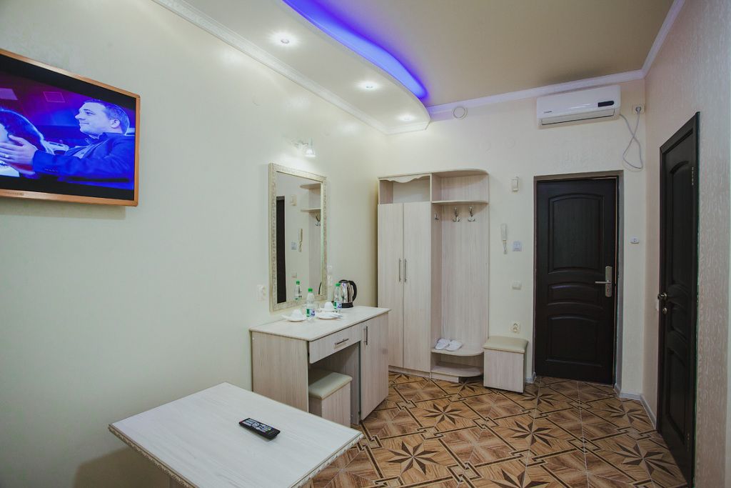 спутниковое телевидение, кабельное телевидение, Wi-Fi, холодильник, кондиционер, фен, будильник, утюг, ванная комната, ванная с джакузи, санузел, банные полотенца, тапочки, гигиенические средства, двуспальная кровать, тумбы, стулья, шкаф для одежды, зеркало, пуфики, чайный набор, сейф, минеральная вода, чайник, унитаз, раковина, вид на город, кресло, стаканы, туалетный столик, туалетные средства, туалет, диван-кровать, телевизор с плоским экраномВ гостиничном номере