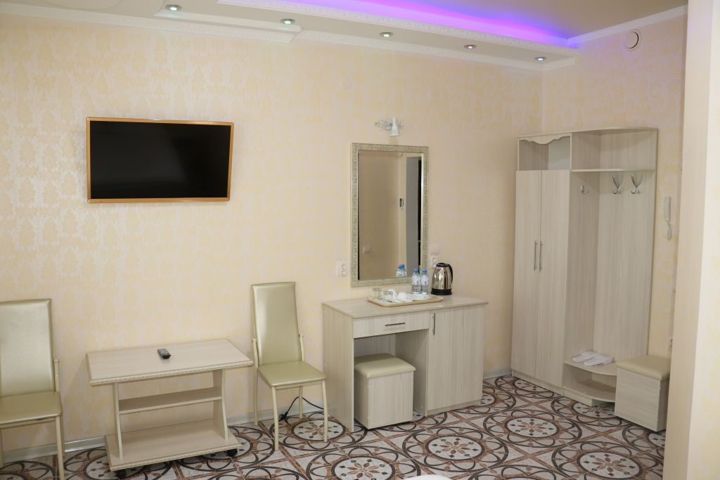 спутниковое телевидение, кабельное телевидение, Wi-Fi, холодильник, кондиционер, фен, будильник, утюг, ванная комната, ванная с джакузи, санузел, халаты, банные полотенца, тапочки, гигиенические средства, двуспальная кровать, тумбы, стулья, шкаф для одежды, зеркало, пуфики, чайный набор, сейф, минеральная вода, чайник, унитаз, раковина, вид на город, кресло, стаканы, туалетный столик, туалетные средства, туалет, телевизор с плоским экраномВ гостиничном номере