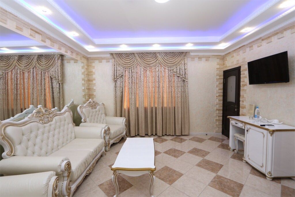 спутниковое телевидение, кабельное телевидение, Wi-Fi, холодильник, кондиционер, фен, будильник, утюг, ванная комната, ванная с джакузи, санузел, банные полотенца, тапочки, гигиенические средства, двуспальная кровать, тумбы, стулья, вешалки, журнальный столик, зеркало, чайный набор, минеральная вода, чайник, унитаз, раковина, вид на город, стаканы, стол, туалетный столик, туалетные средства, туалет, диван-кровать, телевизор с плоским экраномВ гостиничном номере