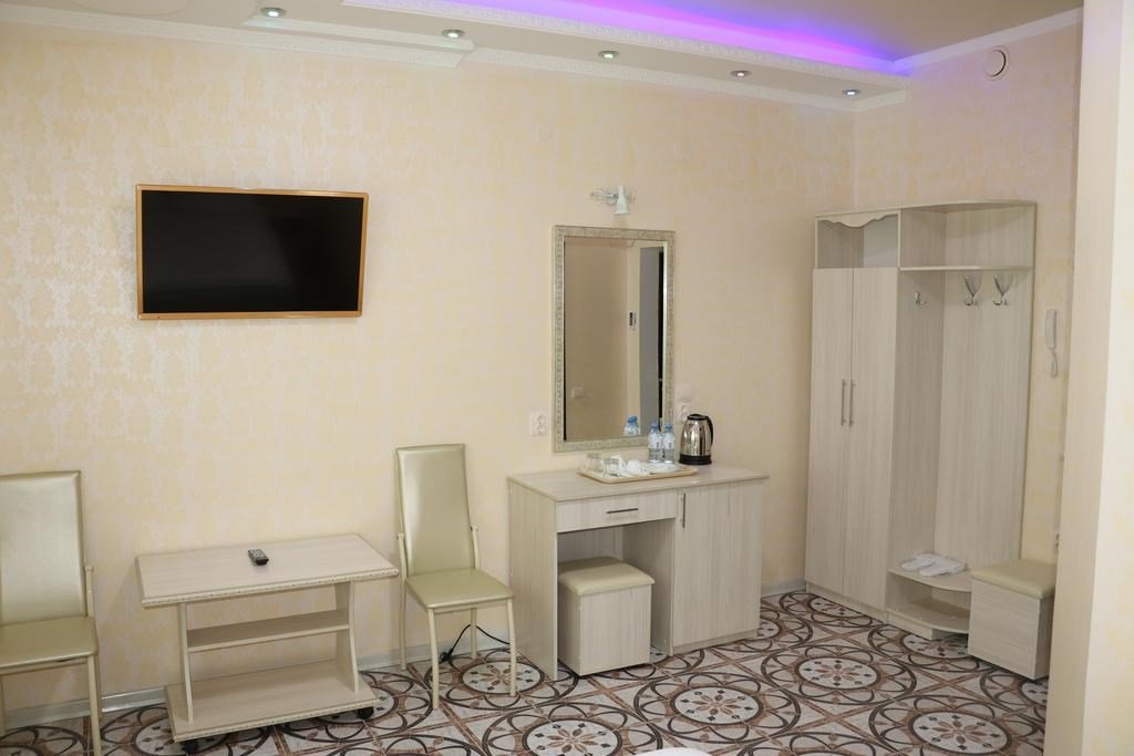 спутниковое телевидение, кабельное телевидение, Wi-Fi, холодильник, кондиционер, фен, будильник, утюг, ванная комната, ванная с джакузи, банные полотенца, тапочки, гигиенические средства, двуспальная кровать, тумбы, стулья, шкаф для одежды, журнальный столик, зеркало, пуфики, чайный набор, сейф, минеральная вода, чайник, унитаз, раковина, вид на город, стаканы, туалетный столик, туалетные средства, туалет, раскладное кресло, телевизор с плоским экраномВ номере