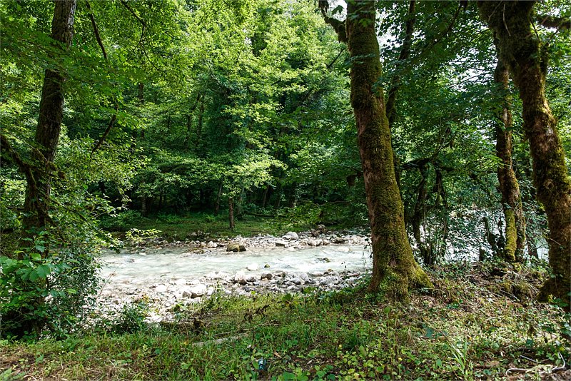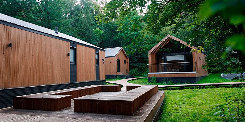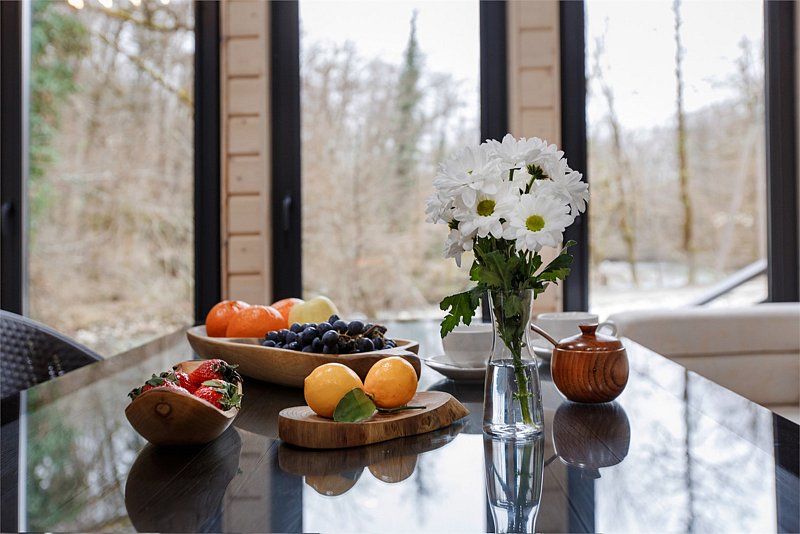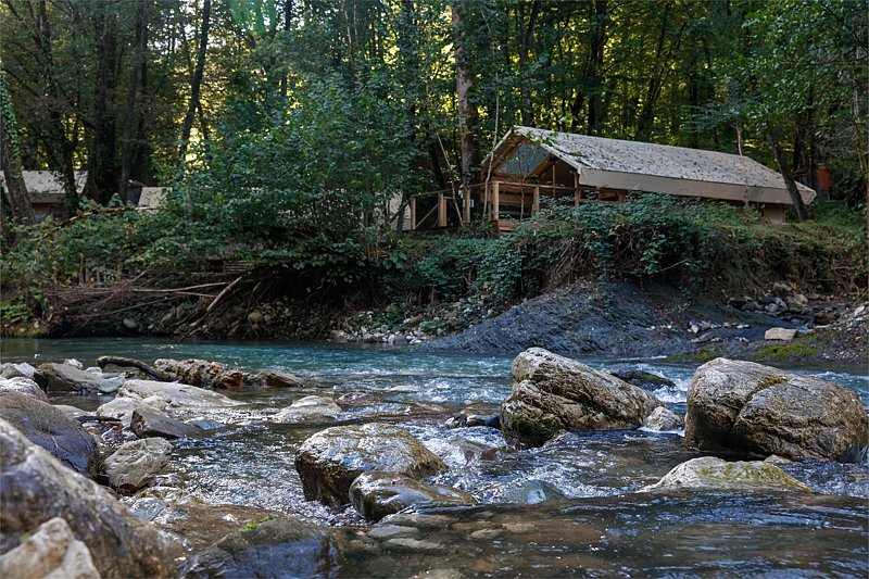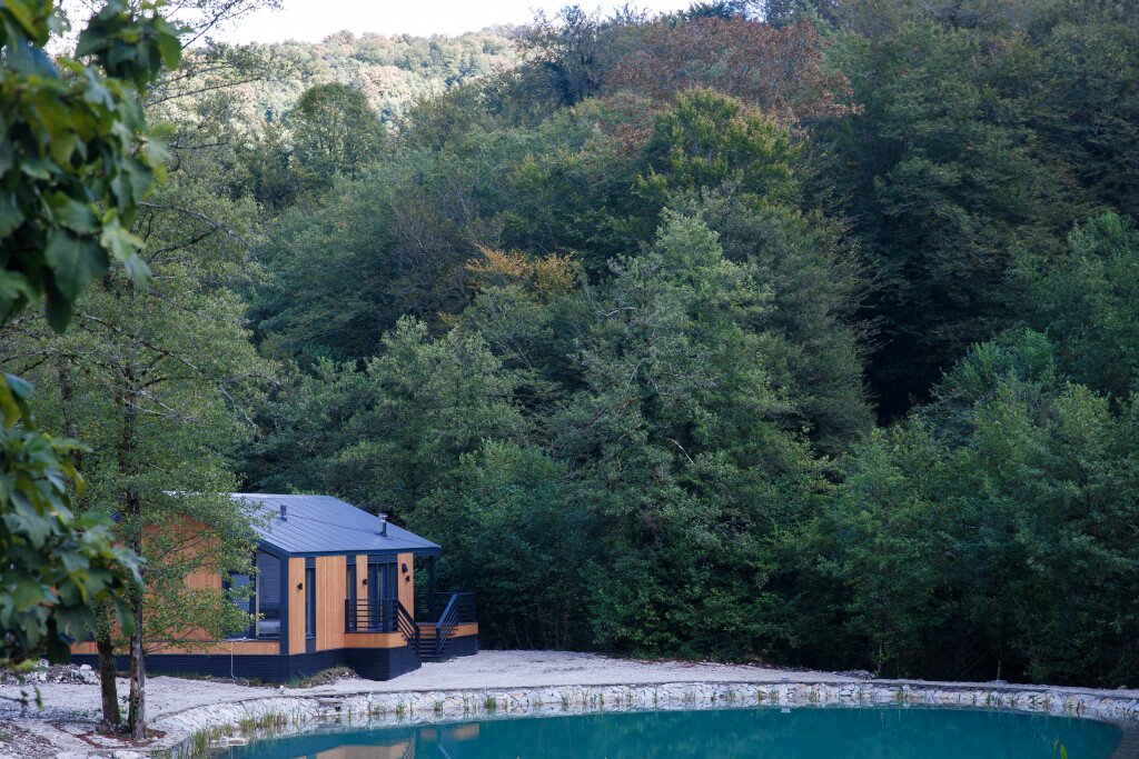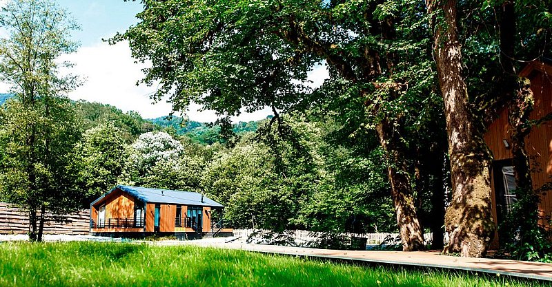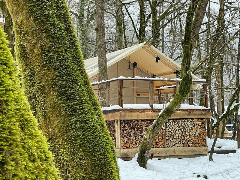 Нетронутая природа, с террасы вид на горную реку и поросший мхом самшитовый лес, в 10 мин Воронцовские пещеры и чайные плантации с пасущимися коровами и лошадями. При этом безупречные красота и комфорт самих домиков, вкуснейшая еда. У нас в доме была сауна и джакузи на террасе. В глэмпинге общая огромная мангальная зона и все виды бань, купелей. Детям - батут, игровая площадка, живые холеные ентоы. Хотя нашим детям интереснее были ящерицы на камнях у реки, лягушки в пруду и тп. ) Можно взять прогулку на лошадях.