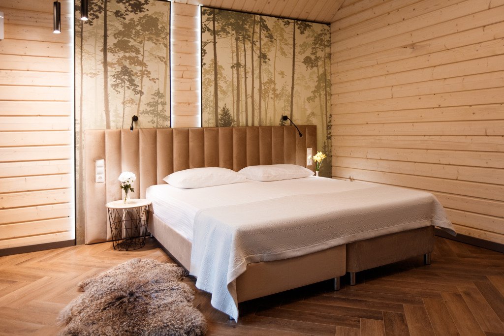 В барнхаусе большая гостиная, кухонная зона, две просторные спальни с кроватью King size, сауна, ванная комната и детская комната с двухярусной кроватью. Идеальное пространство для семейного отдыха и идеальных фотографий.