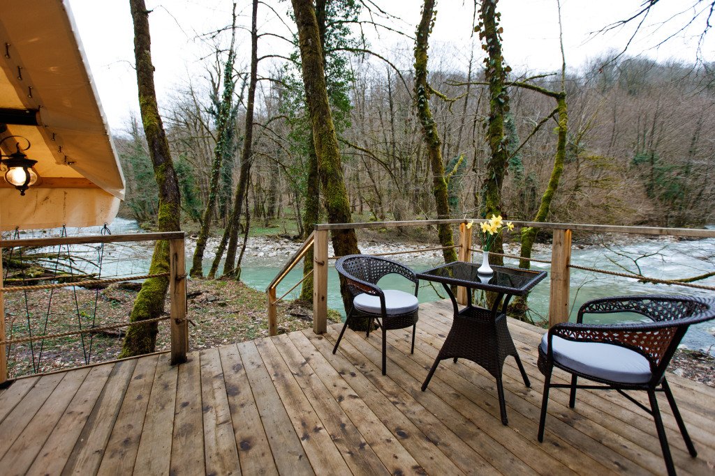 Тент-хаус премиум класса с собственной ванной комнатой и просторной террасой, с мебелью, на берегу реки и видом на лес. Сочетает в себе все необходимое для комфортного отдыха.