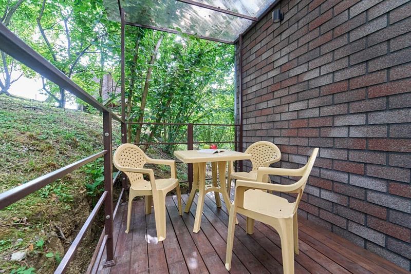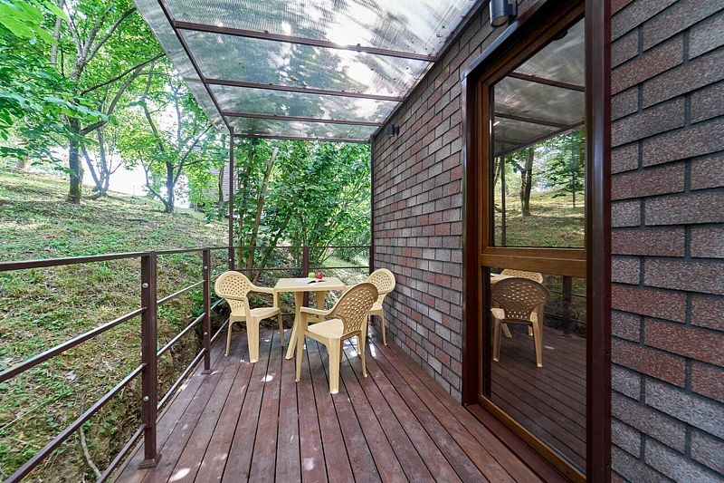 Закрытая терраса с мебелью, где можно посидеть с чашечкой кофе или чая.