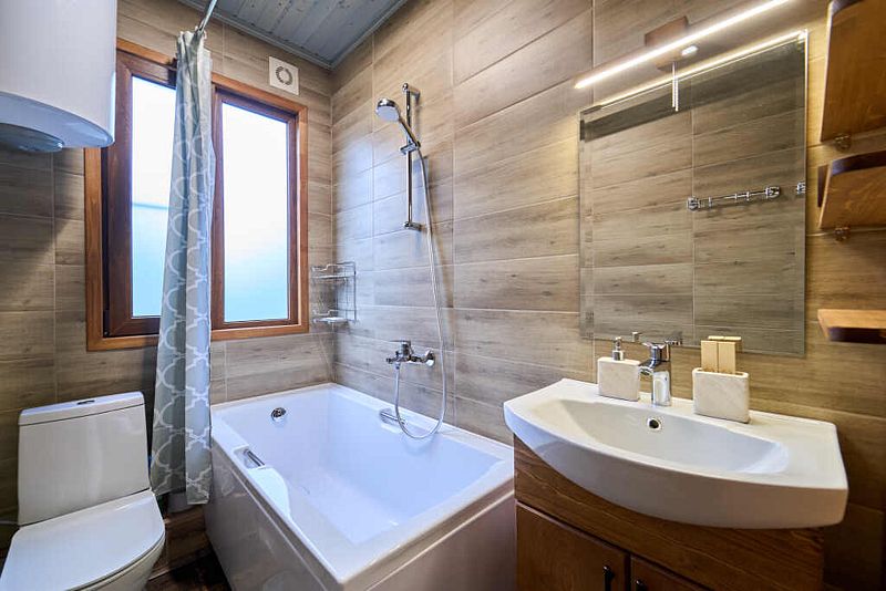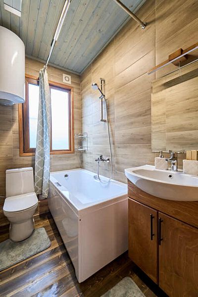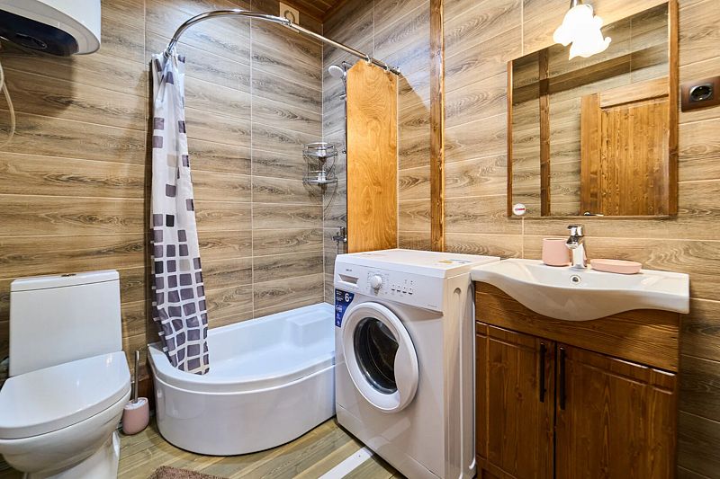 Санузел с ванной, стиральной машиной и водонагревателем на 80 л, средства личной гигиены.