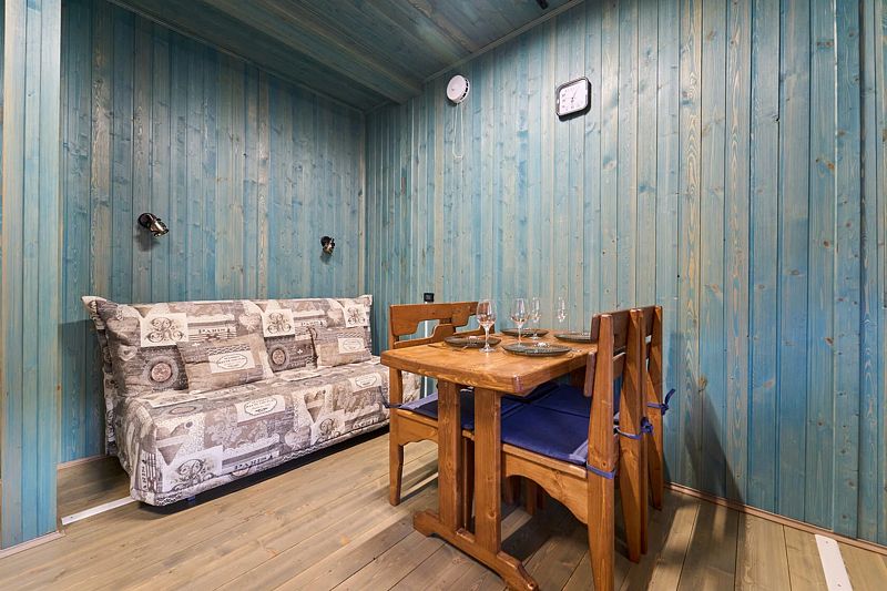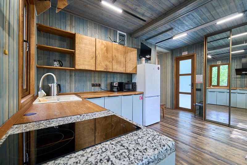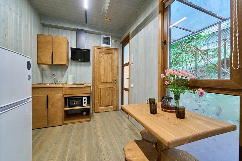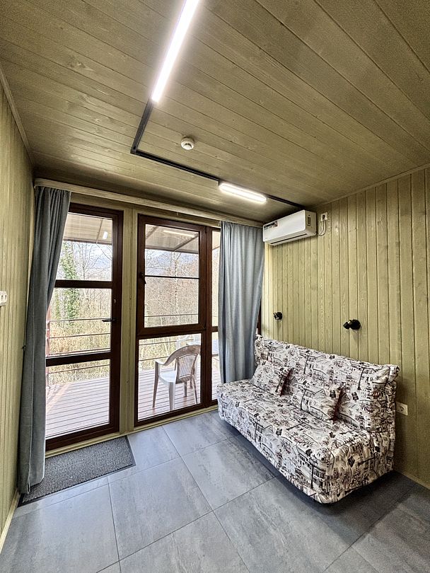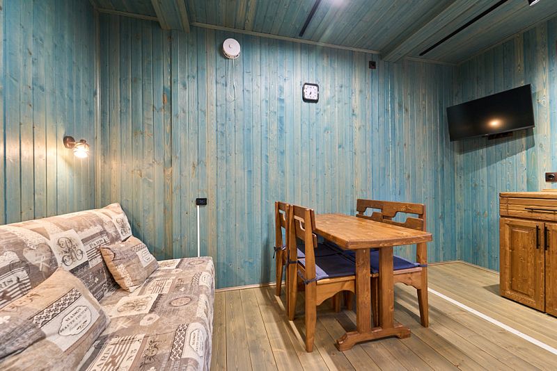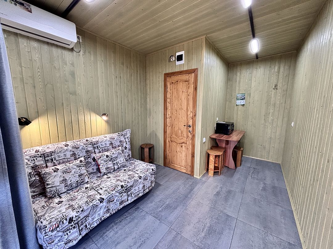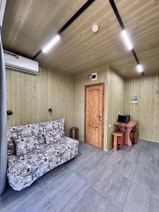 Кухня-гостиная с двуспальным диваном (комплект постельного белья + полотенца) и Smart-TV, оборудованная современной техникой (индукционная плита, СВЧ, кофеварка капельная, чайник и посудой до 4 человек). Пребывание дневное (свыше 4 человек) – 500 ₽, с предоставлением спального места – 1000 ₽ в сутки.