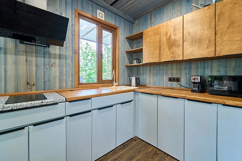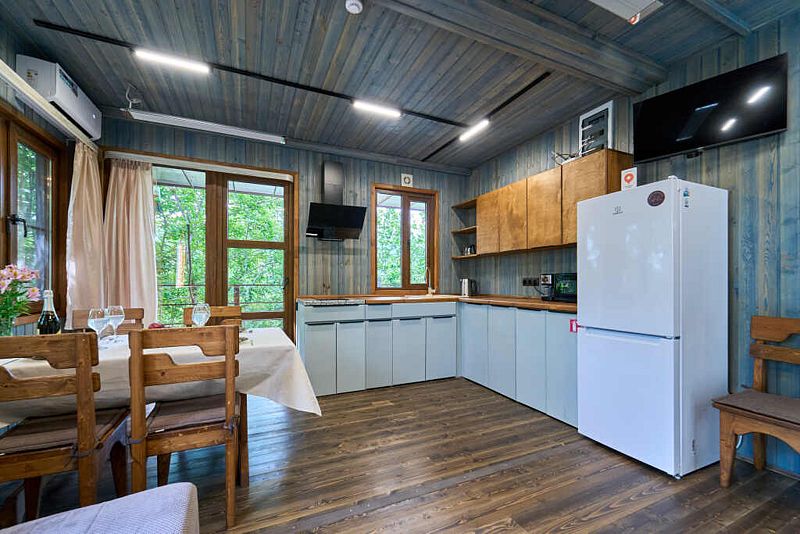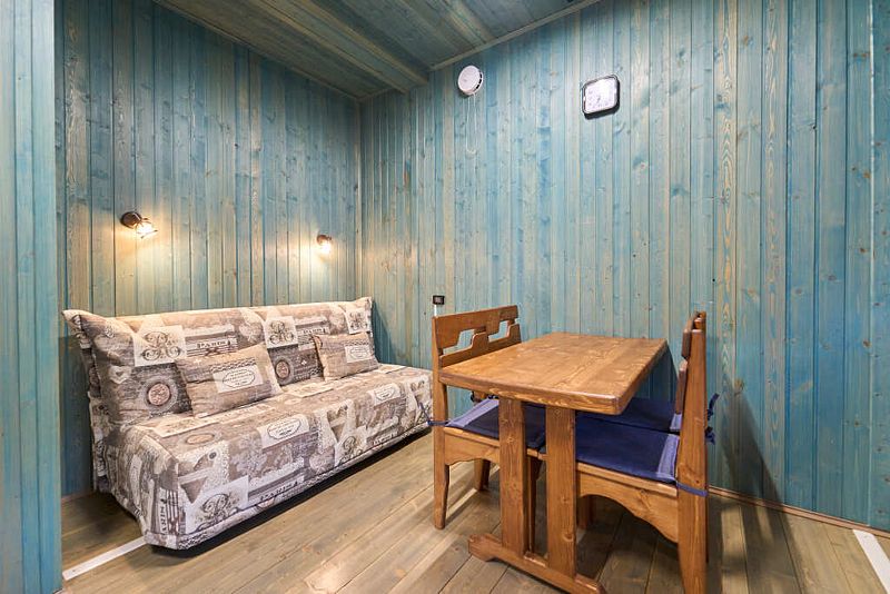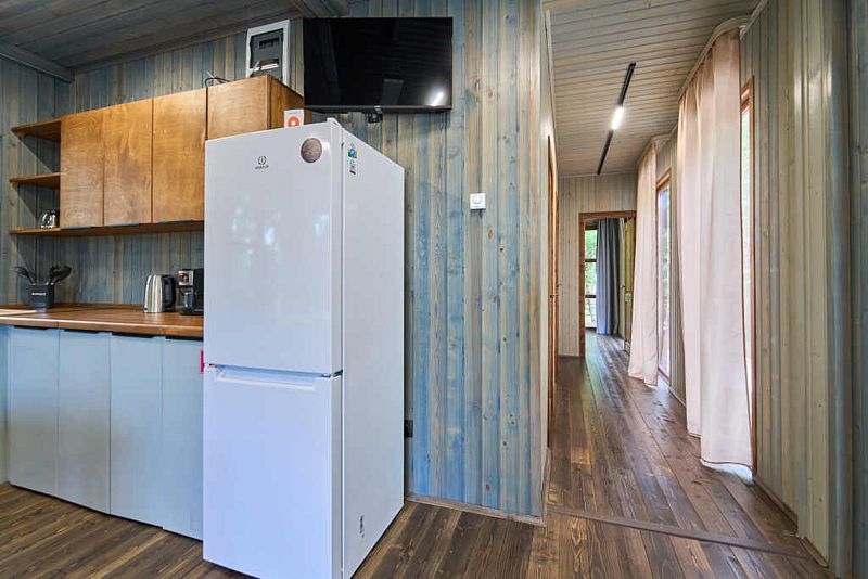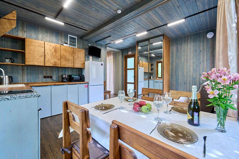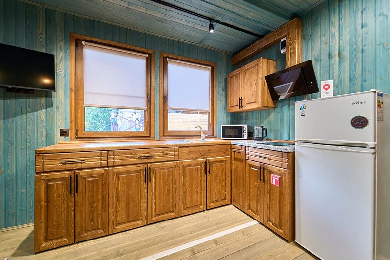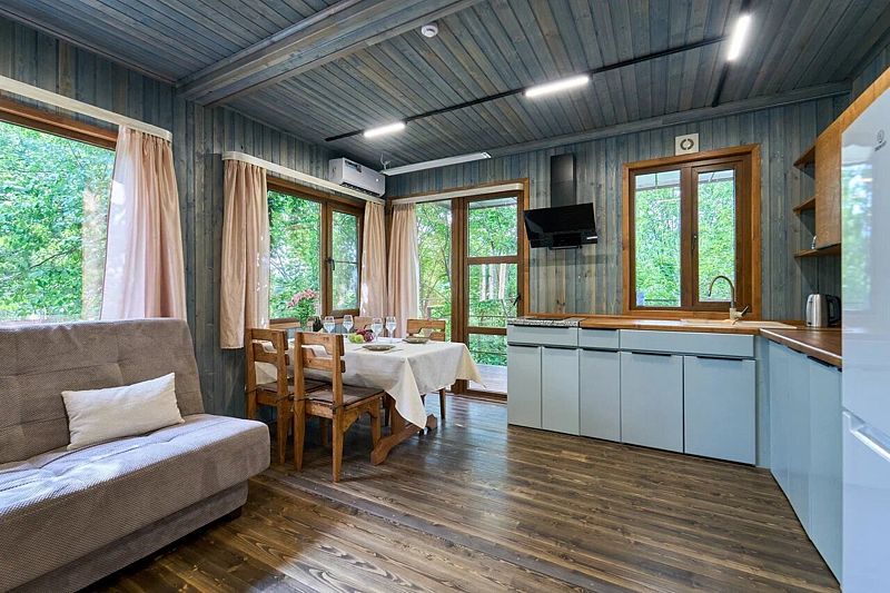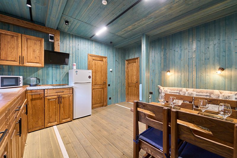 Кухня-гостиная с двуспальным диваном (комплект постельного белья + полотенца) и Smart-TV, оборудованная современной техникой (индукционная плита, СВЧ, кофеварка капельная, чайник и посудой до 4 человек). Пребывание дневное (свыше 4 человек) – 500 ₽, с предоставлением спального места – 1000 ₽ в сутки.
