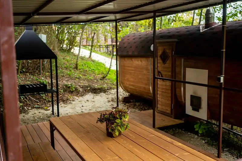 Погрузитесь в атмосферу комфорта в нашей русской бане с чаном и крытой зоной отдыха, где Вы сможете расслабиться после насыщенного дня.