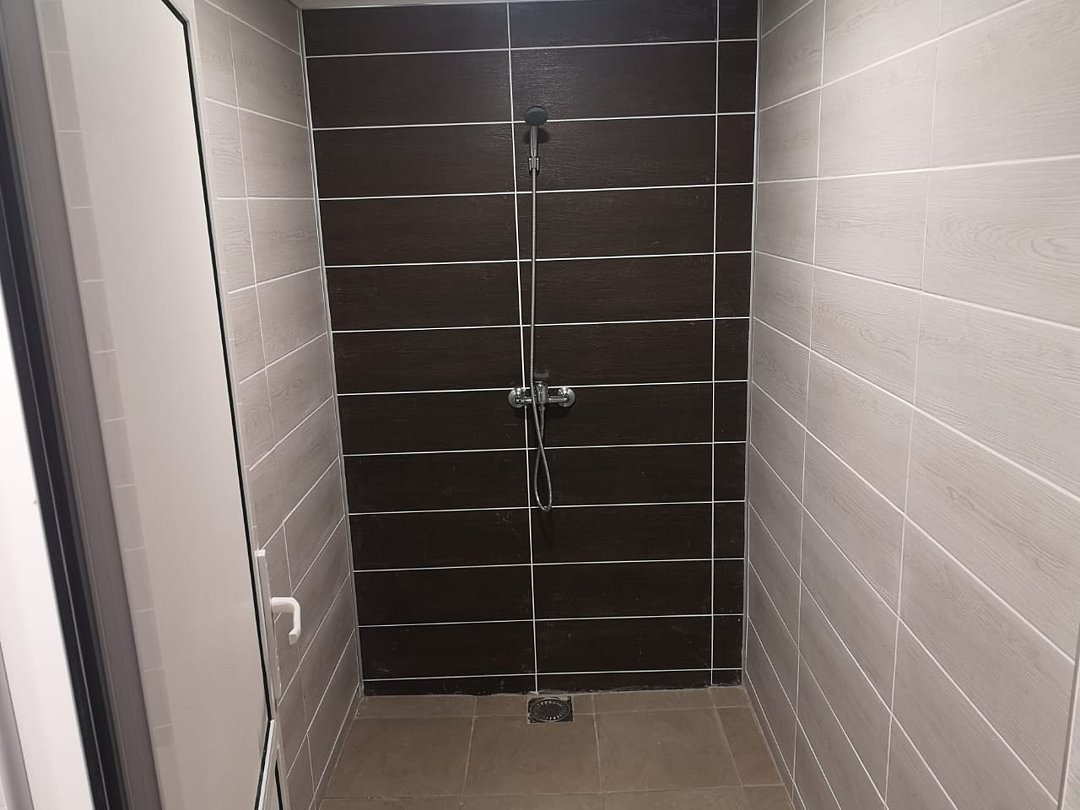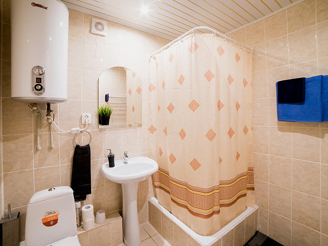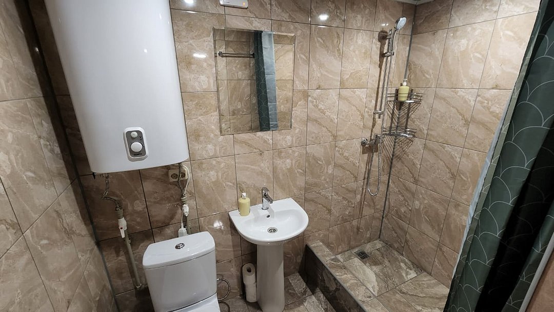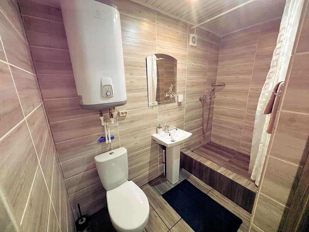 Санузел: душевой блок, умывальник, унитаз, горячая и холодная вода, полотенцесушитель, зеркало.