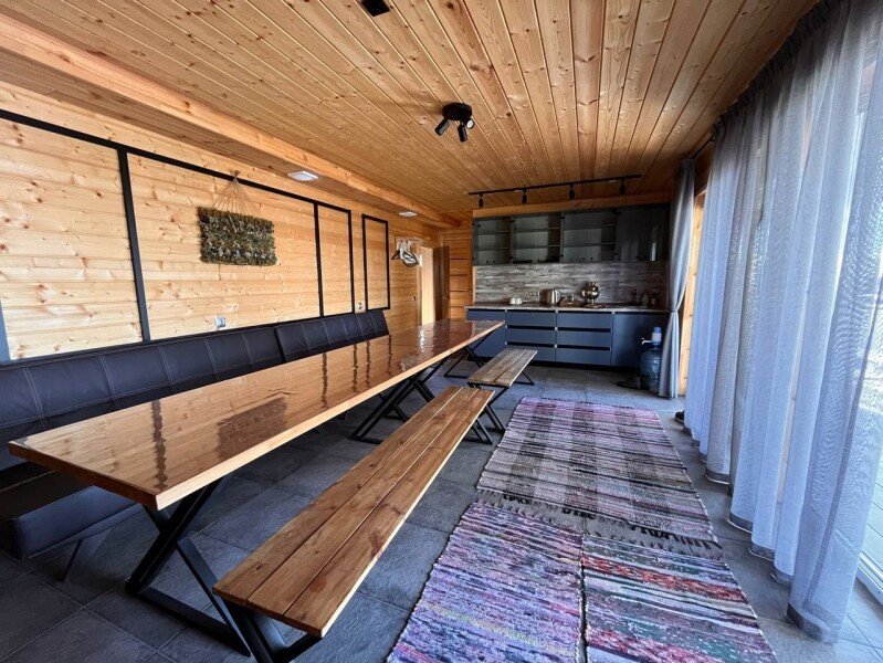 Читать полностьюБанный комплекс на берегу озера Тосканка приглашает до двадцати гостей насладиться уединением и комфортом. Здесь имеется просторная парная, душевые, комната отдыха с кожаными диванами, а также уютная кухонная зона с холодильником и столы, где можно собраться в непринужденной обстановке.