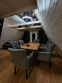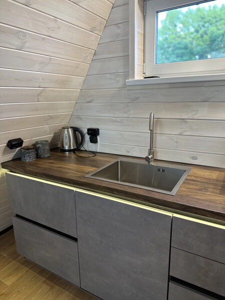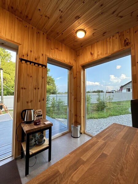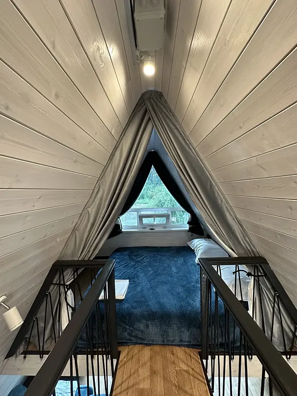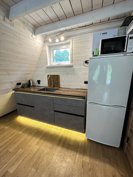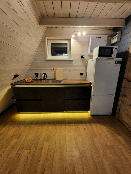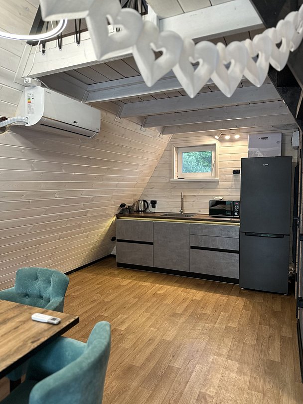 На первом этаже домика расположены современная кухня с обеденным столом, ванная комната с туалетом, телевизор и раскладной диван, который легко превращается в дополнительное двуспальное место. На втором этаже вас ждут два двуспальных места.