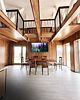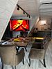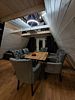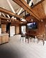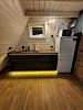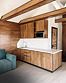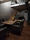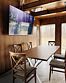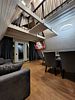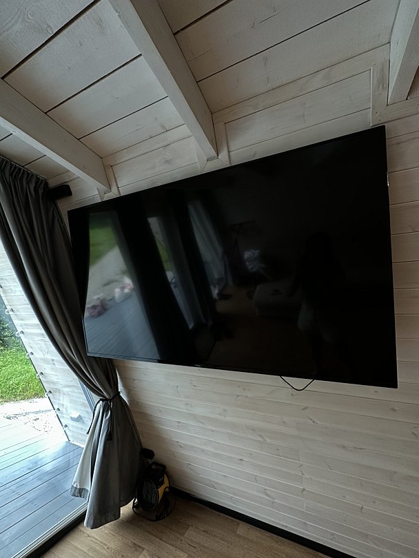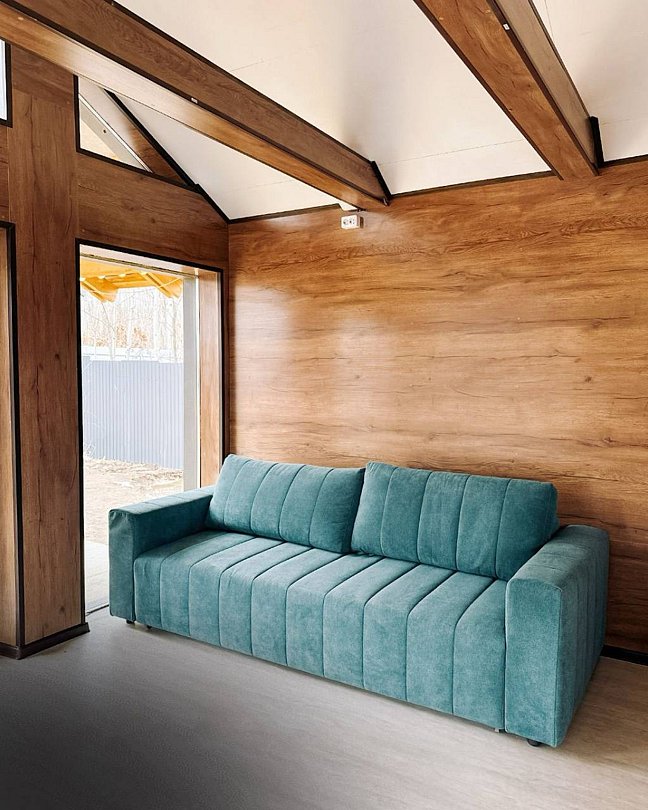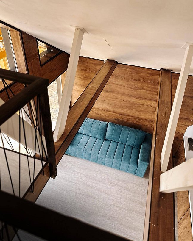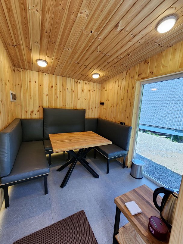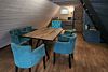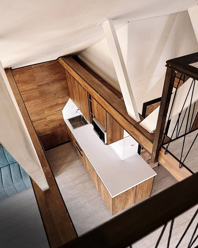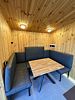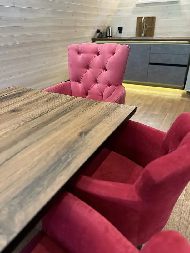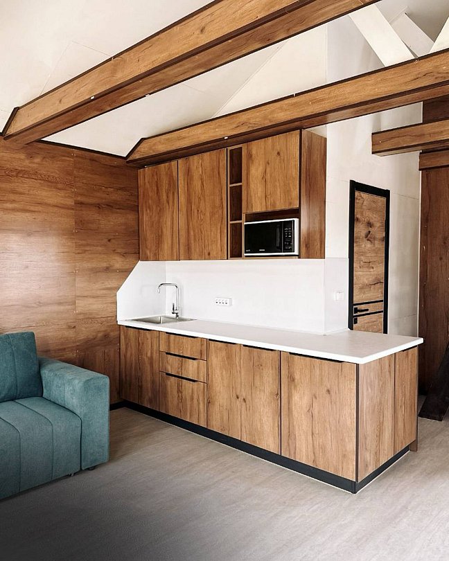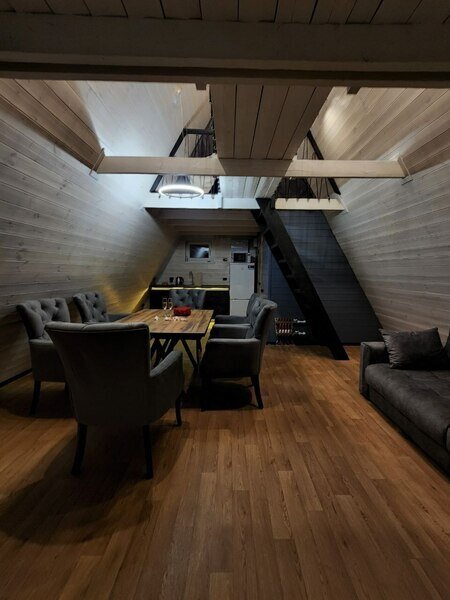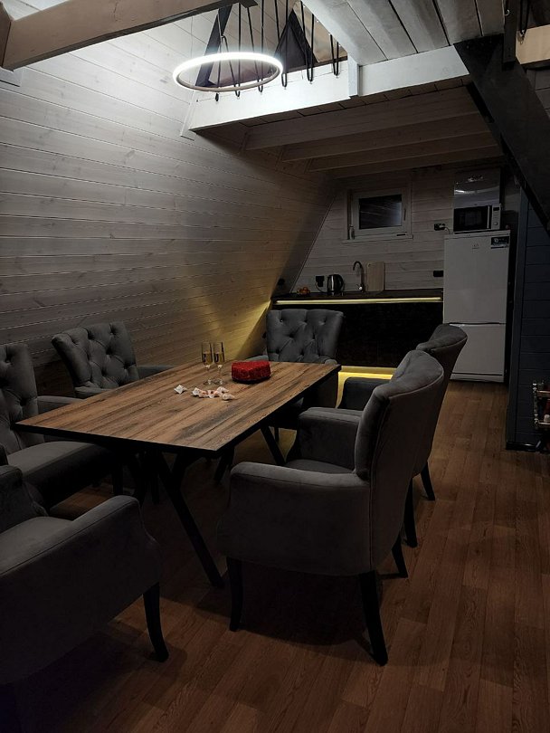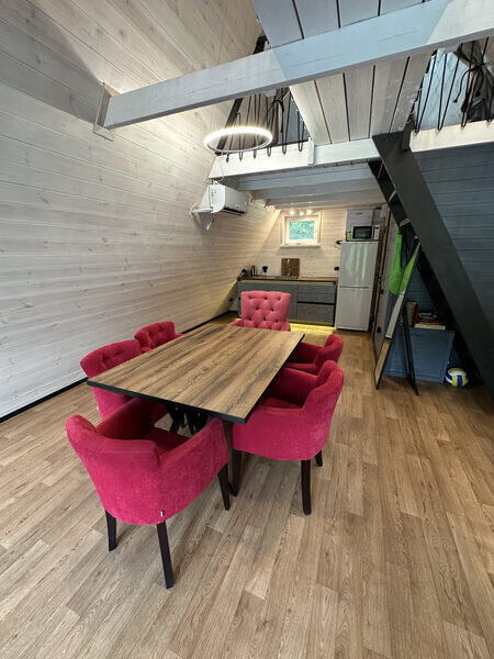 VIP-домик — это уютное пространство для вашего отдыха. На первом этаже расположены современная кухня с обеденным столом, телевизор и раскладной диван, который легко превращается в дополнительное двуспальное место.