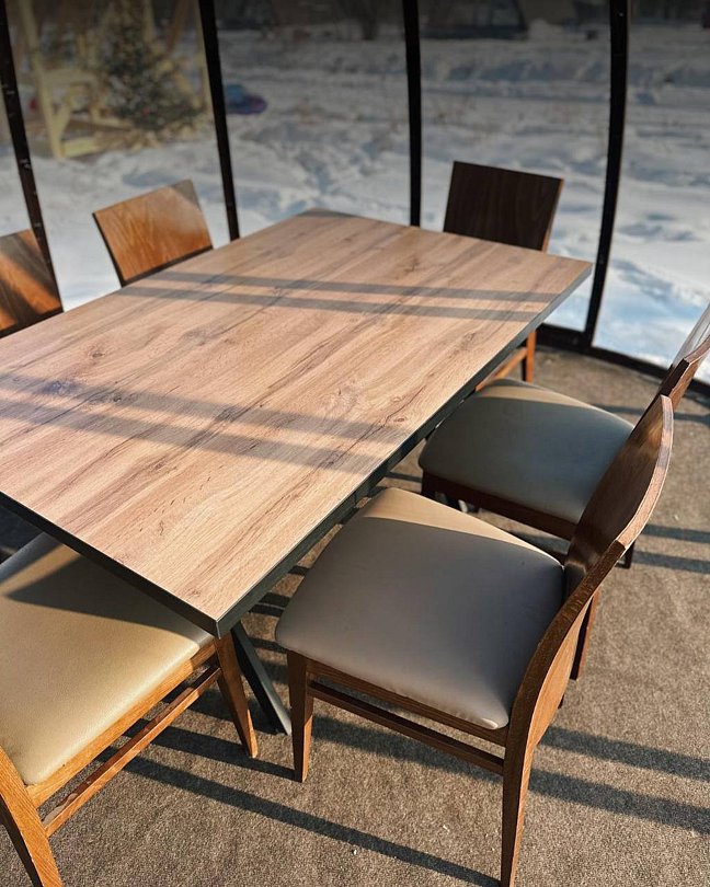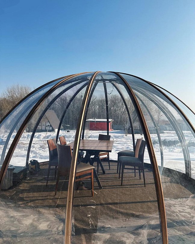Беседка «Иглу» выполнена в форме купола с прозрачными стенами и потолком, что позволяет наслаждаться пейзажами даже в зимний период, поддерживая комфортную температуру внутри на уровне 15–17°С. Дополнительная тепловая пушка обеспечивает уют в любое время года.