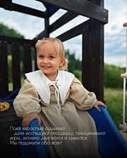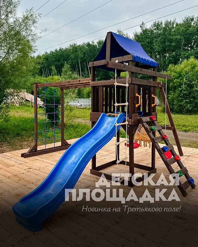 Детская площадка расположена на просторной деревянной террасе, прямо перед домиками глэмпинга, что позволяет родителям легко присматривать за детьми, не отходя далеко от домиков. Площадка оборудована качелями, горкой и разнообразными лазательными элементами, обеспечивая детям активный отдых и радость от игр.