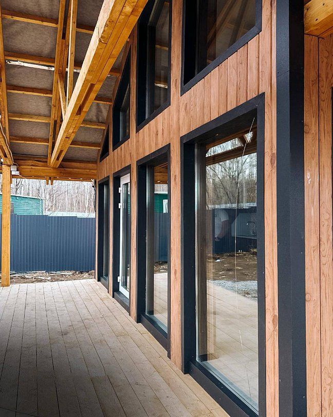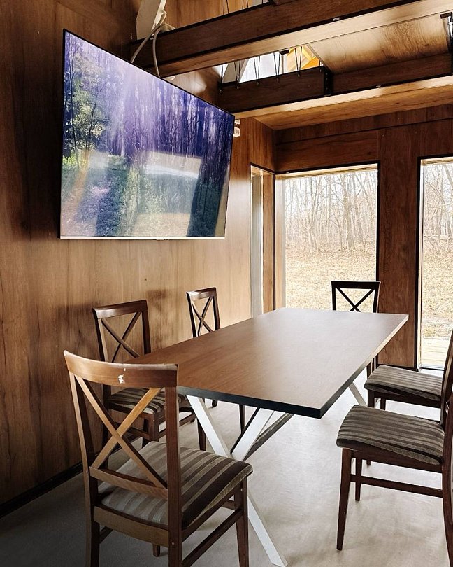Шикарный большой дом с панорамными окнами, открывающими завораживающий вид на лес, и просторной террасой — идеальное место для отдыха! Внутри гостей ждут два больших стола, уютный раскладной диван, плазменный телевизор и спальное место для двоих на втором этаже.