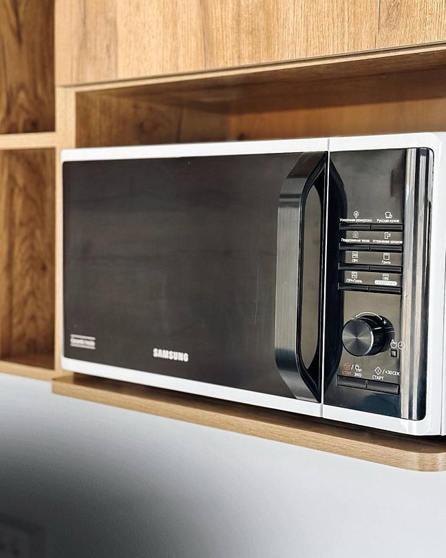 Кухня оборудована чайником, холодильником, микроволновой печью и индукционной плитой, а также всей необходимой посудой: тарелками, кружками, столовыми приборами и посудой для приготовления еды.
