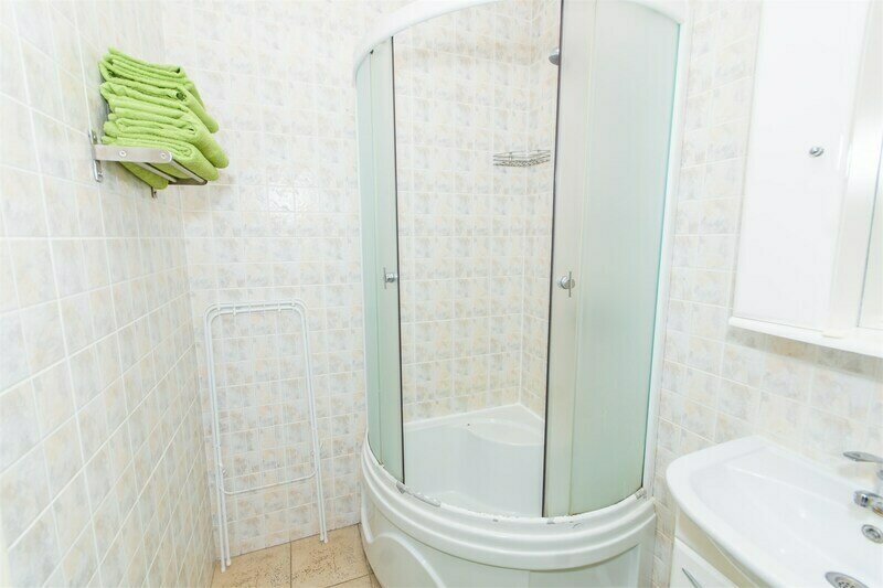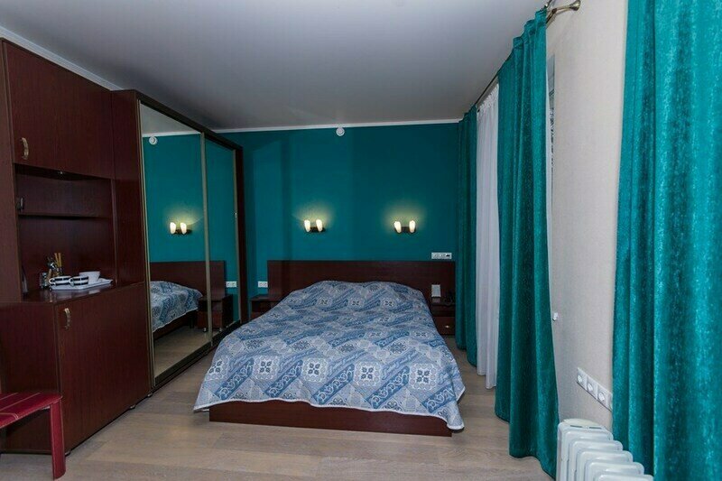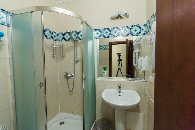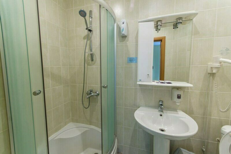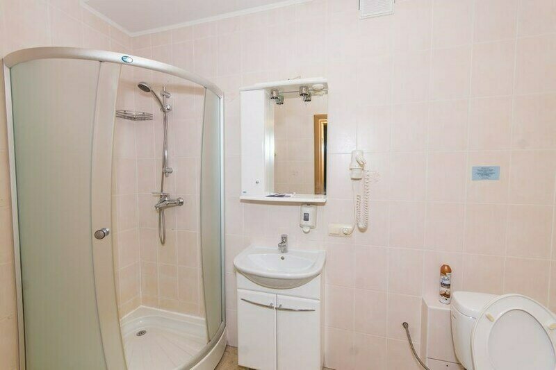 В сан.узле нет держателя для фена, зеркало висит очень высоко. Человек ростом 150 см видит в зеркале только свою голову. На окне выходящем на дорожку нет ночной шторы, вечером всё видно -