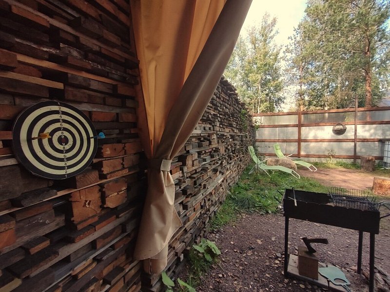 В коттедже имеется собственный закрытый дворик-садик, где гости будут одни на территории, работает вечернее освещение; имеется беседка с мангальной зоной и диванами, мангал, шампуры, решётка, веер, костровая зона.