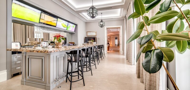 Бар украшает элегантная мраморная стойка и роскошные виды на инфинити-бассейн и искусственное озеро.