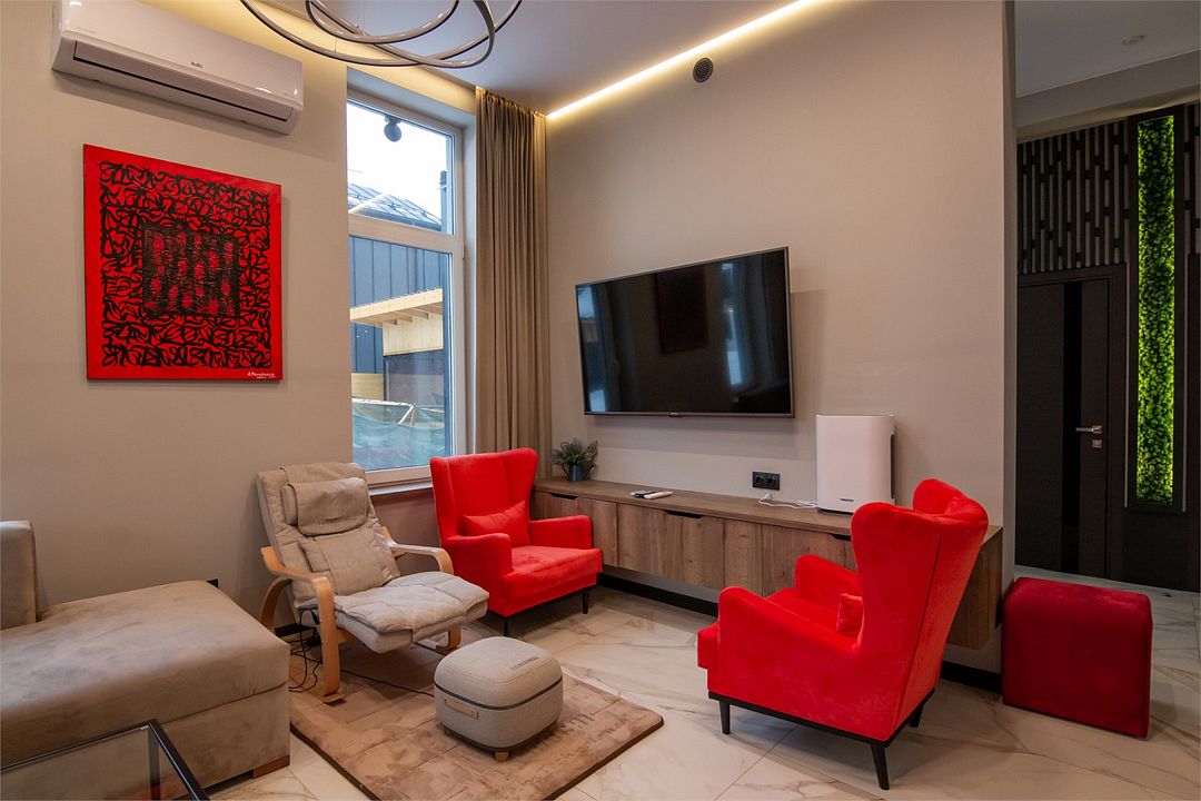 Уникальная атмосфера отдыха в загородной резиденции! В каждой резиденции 5 спален с прекрасной звукоизоляцией, 4 ванных комнаты, встроенная функциональная кухня, обширная гостиная, универсальная сауна/хамам/баня, терраса, уличное барное патио с экраном и проектором, частная территория с всесезонной дровяной купелью, открытая костровая зона и зона для приготовления барбекю с мангалом - все это в каждой резиденции и только для Вас!