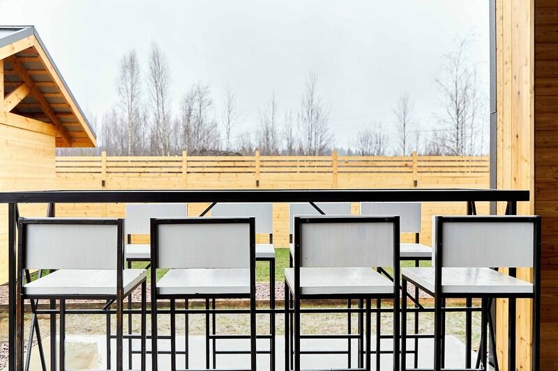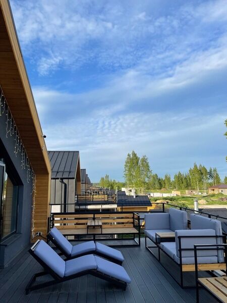 Прекрасное место для отдыха с семьей или друзьями. Каждая резиденция состоит из 5 спален, огромной гостиной со встроенной кухней, сауны, трех ванных комнат, дровяной всепогодной купели, беседки для барбекю или банкета, костровой зоны, летней террасы для завтрака, собственного летнего кинотеатра с большим экраном и террасы для принятия солнечных ванн. У каждой резиденции своя парковка на три автомобиля и просторная лужайка для банкетного шатра. Резиденция имеет красивый вид на поля. Халаты, тапочки, полотенца для сауны, шампунь и гель для душа входят в стоимость аренды. Так же как все необходимое для приготовления барбекю. Очень приятным дополнением является массажное кресло-качалка японского производителя Ямагучи, а также массажер для ног, очиститель и увлажнитель воздуха. Сделайте свой отдых действительно расслабляющим!