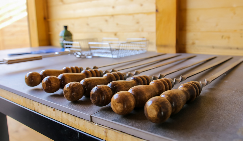 В набор для гриля входит: пакет угля 3 кг, жидкость для розжига, решетка, спички, шампуры предоставляются в аренду.