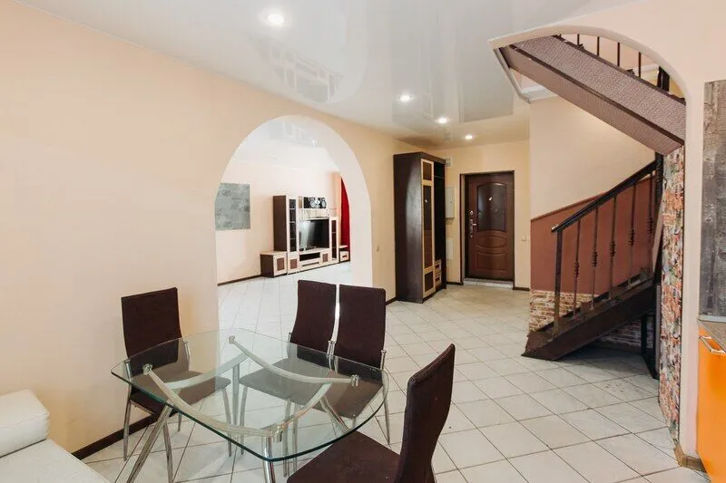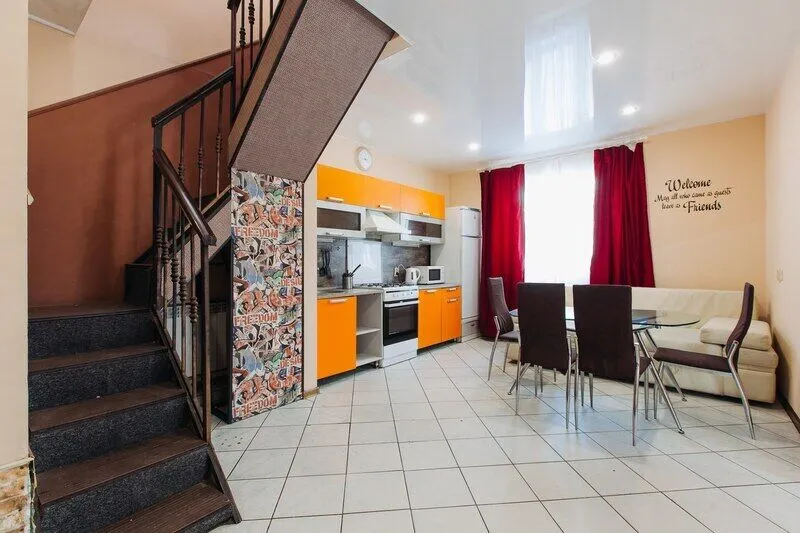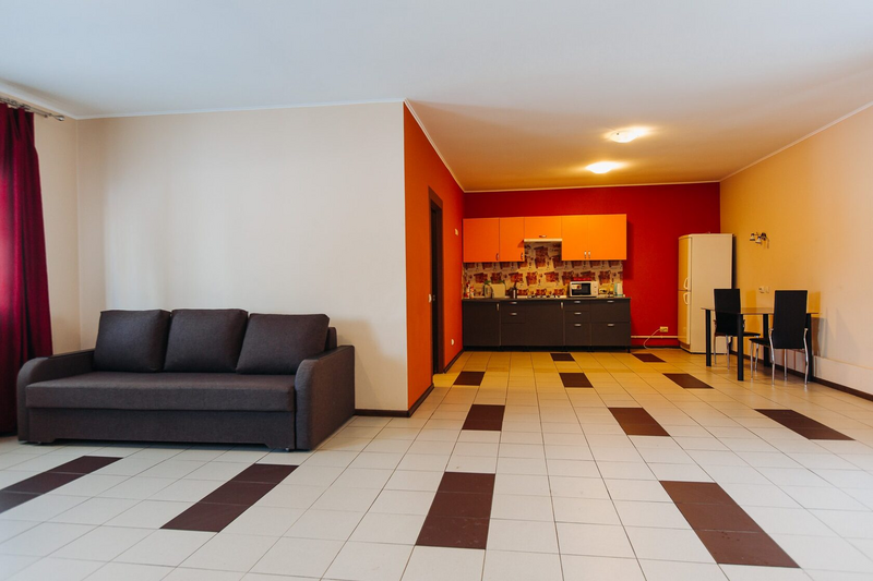 1 этаж: кухня и гостиная с мягкими диванами, которые используются как спальные места.