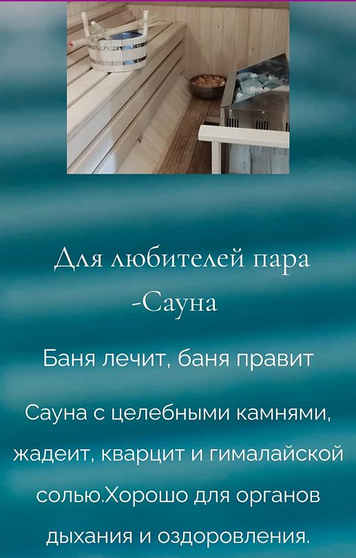 Вы можете воспользоваться сауной🔥🔥 с целебными камнями, кварцит, жадеит и гималайской солью, полезно для органов дыхания и оздоровления. (сауна в аренду не включена, оплачивается отдельно).