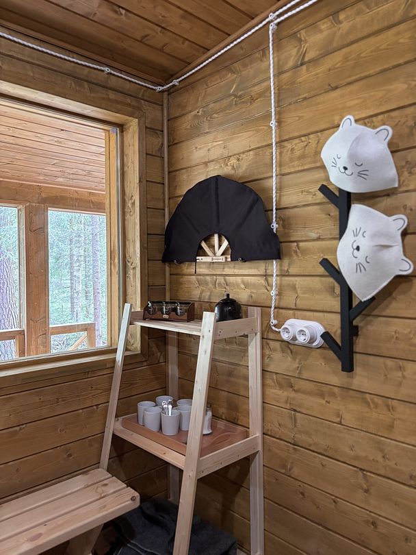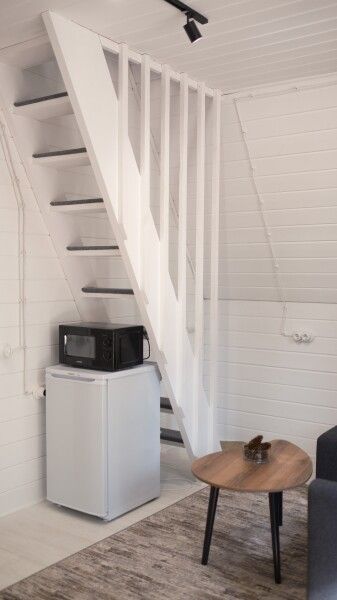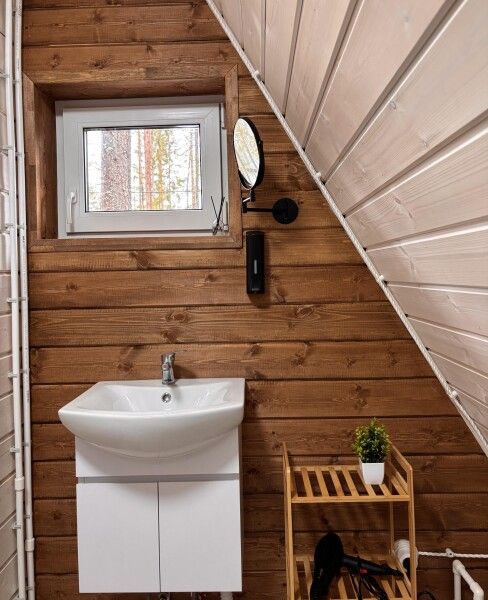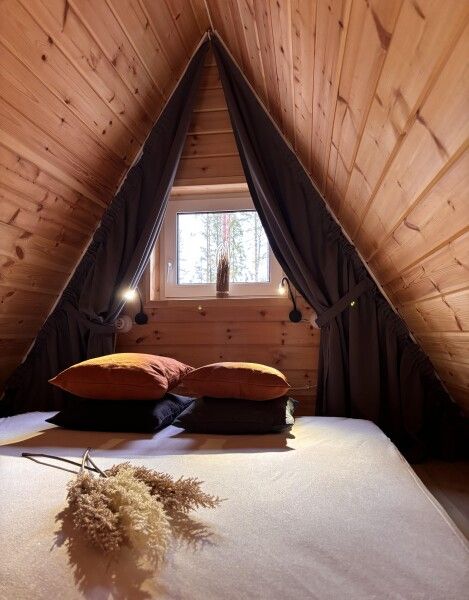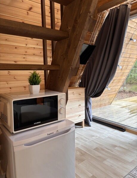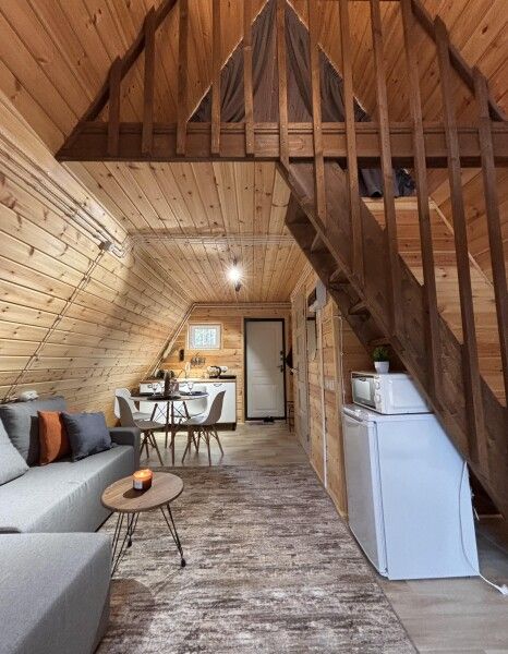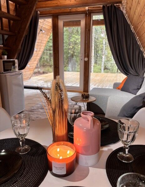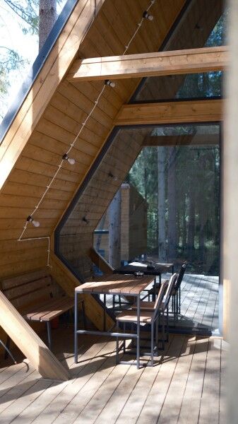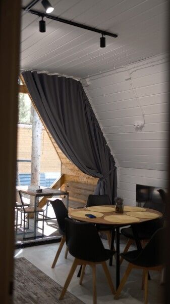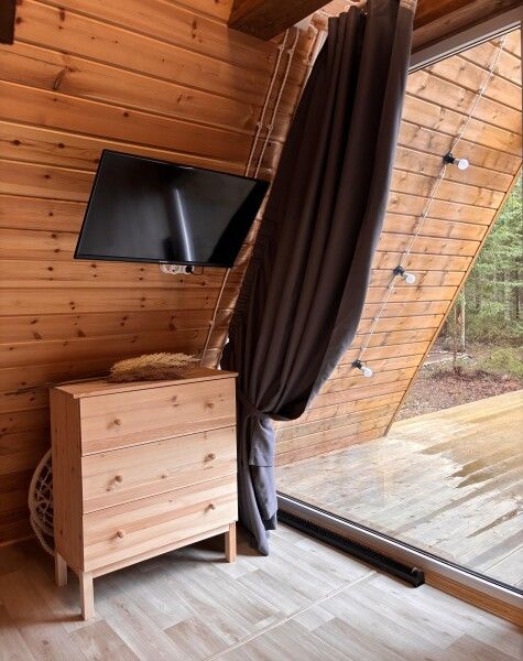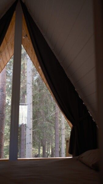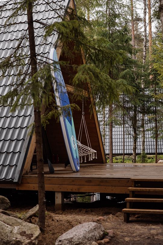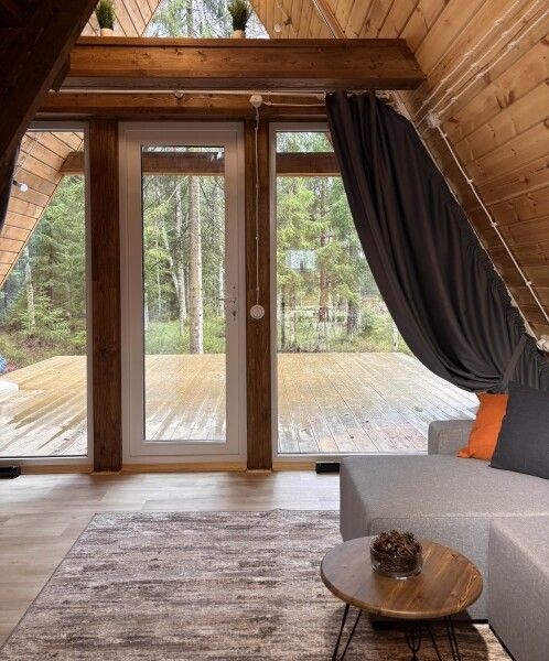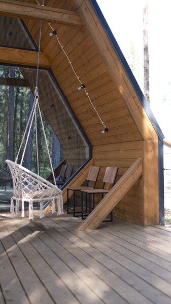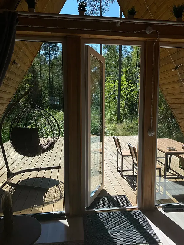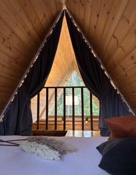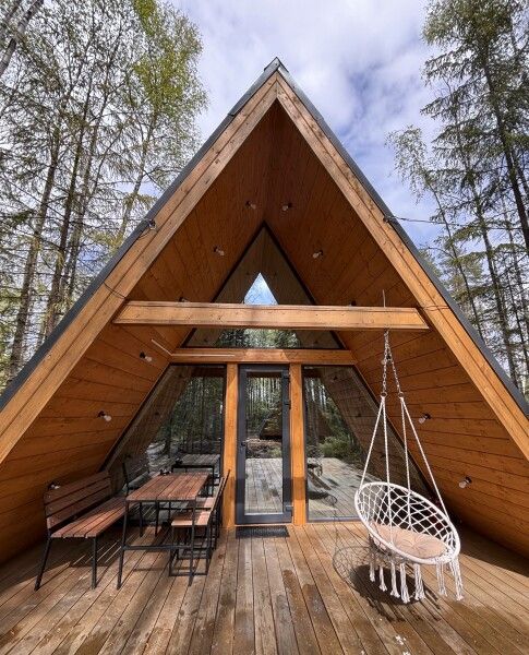 Всего в комплексе представлено шесть А-фреймов, рассчитанных на проживание от 2 до 6 человек. Каждый домик оснащен террасой с мангалом и зоной для отдыха, а панорамные окна открывают великолепный вид на лес.