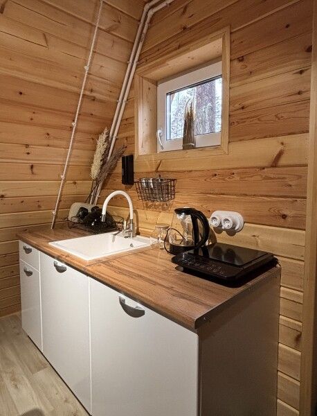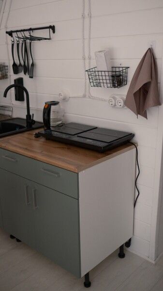 - мини-кухня со всем необходимым (микроволновка, холодильник, варочная панель, чайник, посуда);
