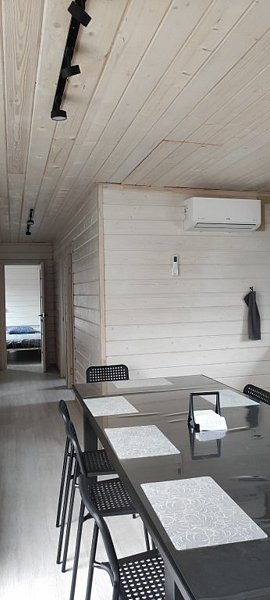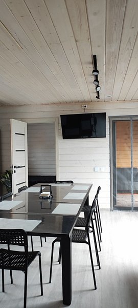 Для больших компаний есть удобный стол 1х3 м. Дом отапливается теплым полом с управлением "умный дом".