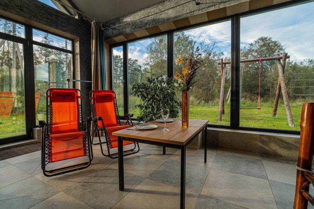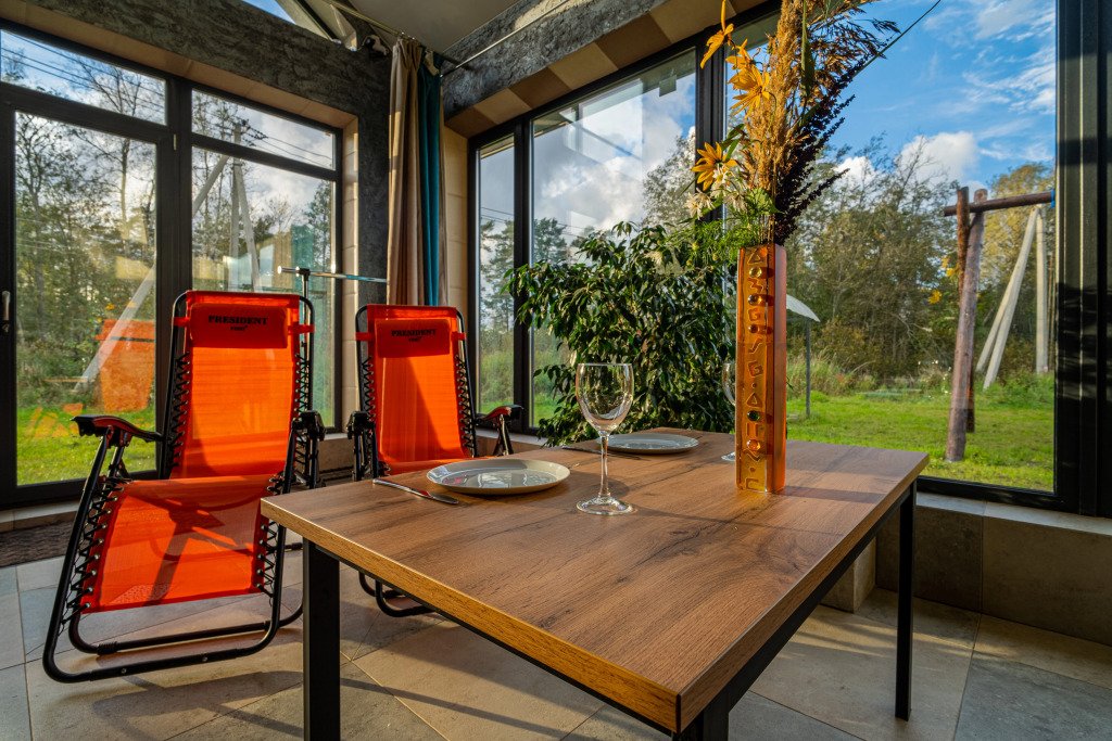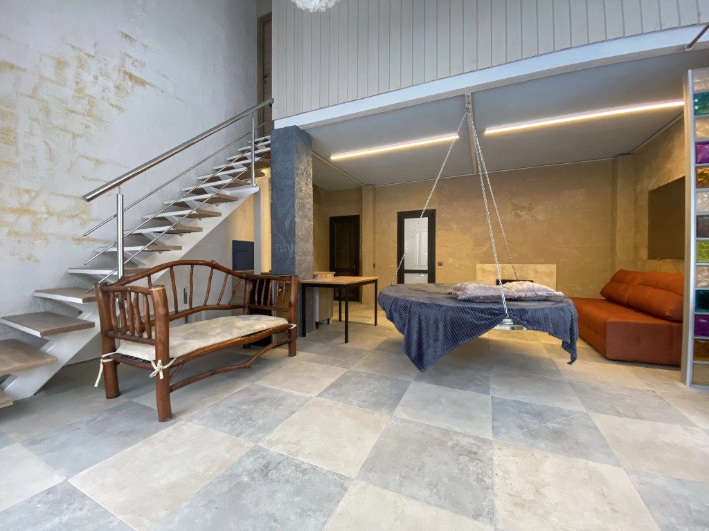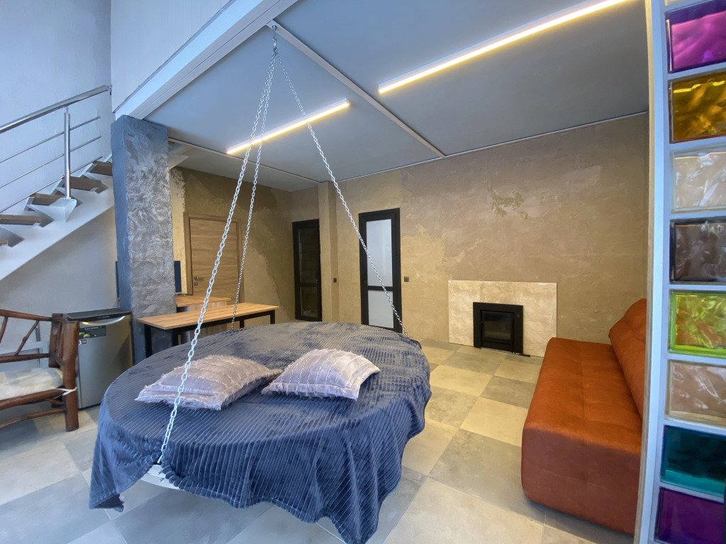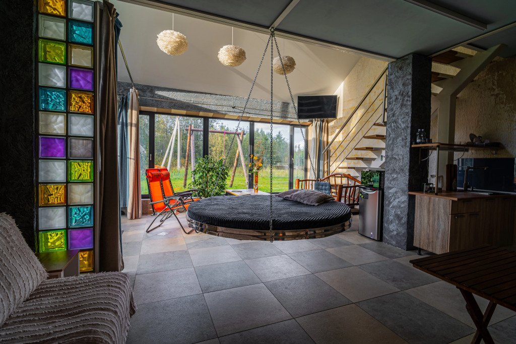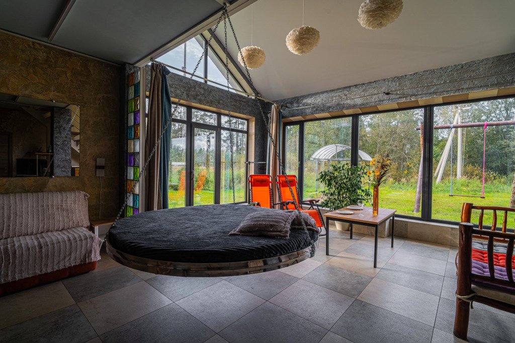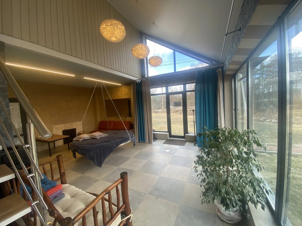 Гостям предлагается коттедж с баней. Для комфорта гостей: комната отдыха с камином, раскладным диваном и подвесной кроватью. На втором этаже имеется отдельная спальня с двуспальной кроватью. Всего в коттедже 4 спальных места.