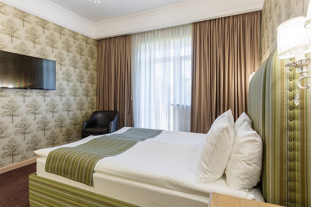 телевизор, кабельное телевидение, Wi-Fi, кондиционер, фен, радио, ванна или душевая кабина, халаты, банные полотенца, тапочки, гигиенические средства, две односпальные или большая двуспальная кровать, шкаф для одежды, письменный стол, сейф, ковровое покрытие, вид на садВ номере