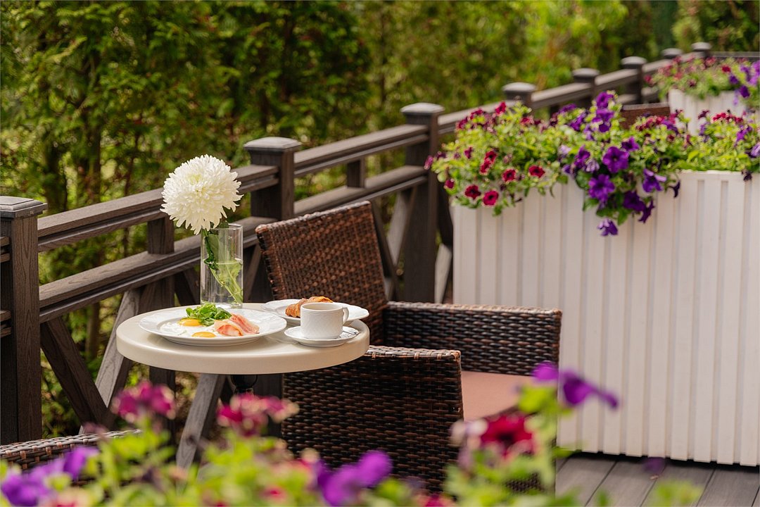 холодильник, фен, плита для приготовления пищи, микроволновая печь, душевая кабина, халаты, банные полотенца, тапочки, гигиенические средства, балкон с красивым видом, кровать «King size», диван, стулья, шкаф для одежды, вешалки, обеденный стол, зеркало, комод, унитаз, раковина, душ, вид на садВ номере