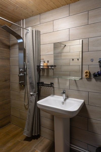 Санузел: раковина, унитаз, душевая панель, фен, мыло, шампунь, гель для душа;