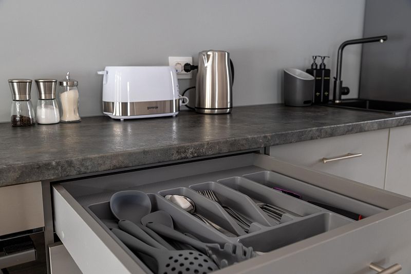 Оборудованная кухня (холодильник, плита, духовка, вытяжка, микроволновка, тостер, чайник, посудомоечная машина, вся необходимая посуда и кухонные принадлежности, для готовки есть масло, соль, сахар, специи).