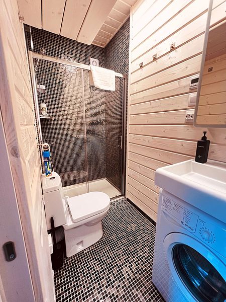 Санузел с душевым уголком, фен, стиральная машина, средства гигиены.