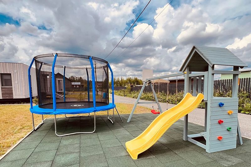 Новый современный комфортабельный дом для отдыха в аренду на берегу лесного озера «Маролампи»! 31км от КАД, 200м до пляжа, полностью оборудованная кухня, премиальное белье, панорамные окна, настольные игры, русская баня, детская площадка с батутом, парковка у дома.