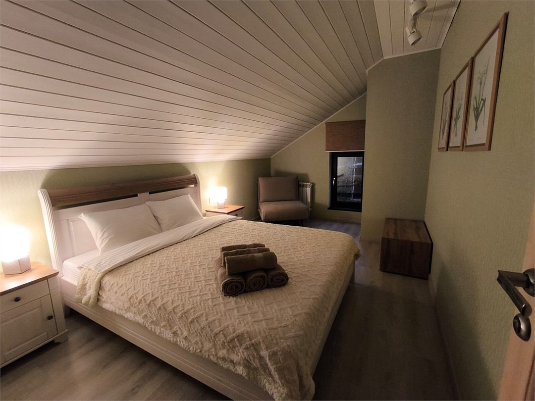 2 спальни, 2 кресла-кровати, ТВ, 2 с/у, душ. кухня. СПА: турецкая парная (хаммам), уличный чан на дровах, холодная купель.