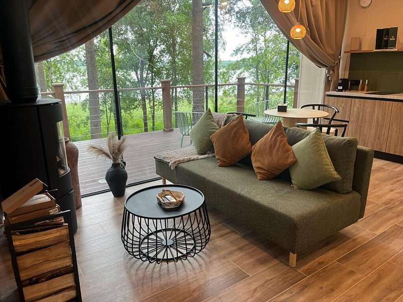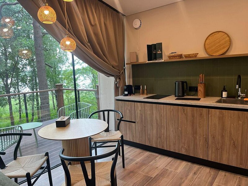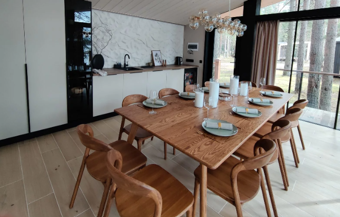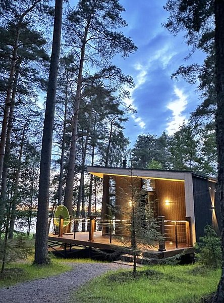 На улице большая терраса с уличной мебелью, где можно наслаждаться отдыхом на свежем воздухе с видом на озеро и лес.