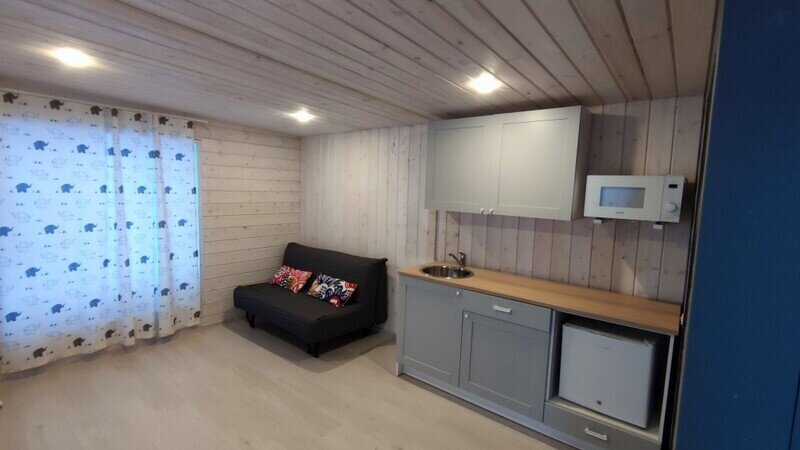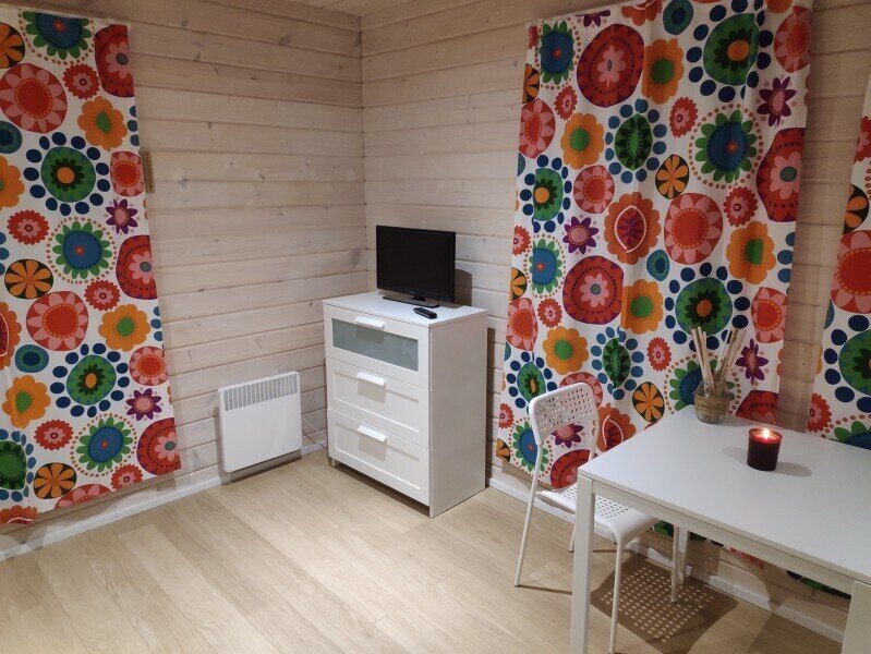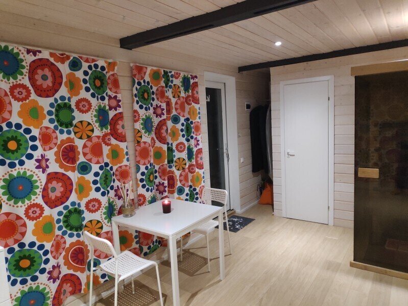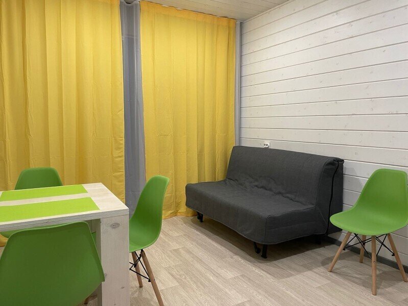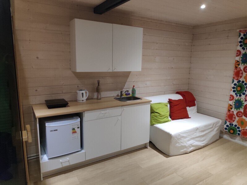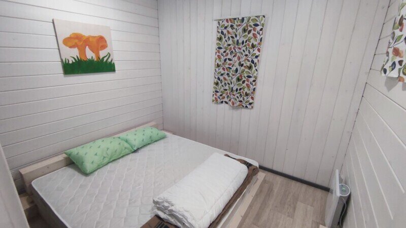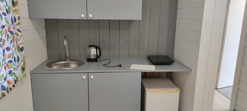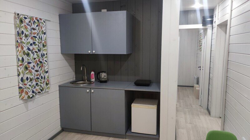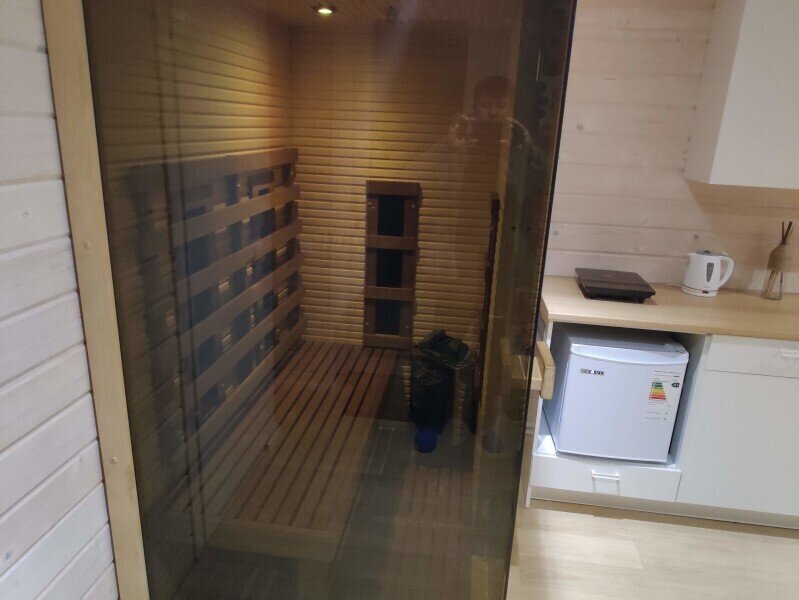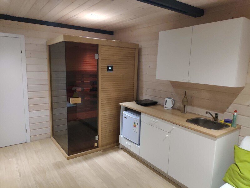 Семейный отдыхДостоинстваОчень уютный домик для спокойного отдыха на двоих или ещё с ребёнком на раскладушке. Диван удобный. Изюминка - ИК-кабина, быстро и хорошо нагревается и комфортно сидеть в ней с глинтвейном или чаем и смотреть кино прям из неё. Мини-кухня, столик, душ, всё удобно. Спасибо Сергею за отзывчивость, как пишут в остальных комментариях. Магаз рядом;)