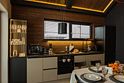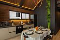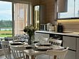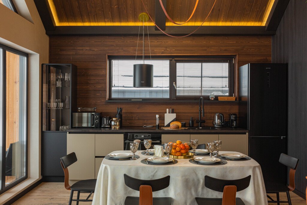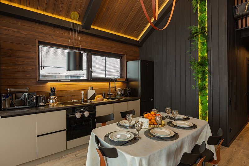 В каждом коттедже оборудованная кухня со всем необходимым для приготовления пищи. Бытовая техника: духовой шкаф, плита, вытяжка, микроволновая печь, электрический чайник, кофеварка, холодильник и посудомоечная машина. Посуда и столовые приборы на 6 персон. Кухонная утварь.