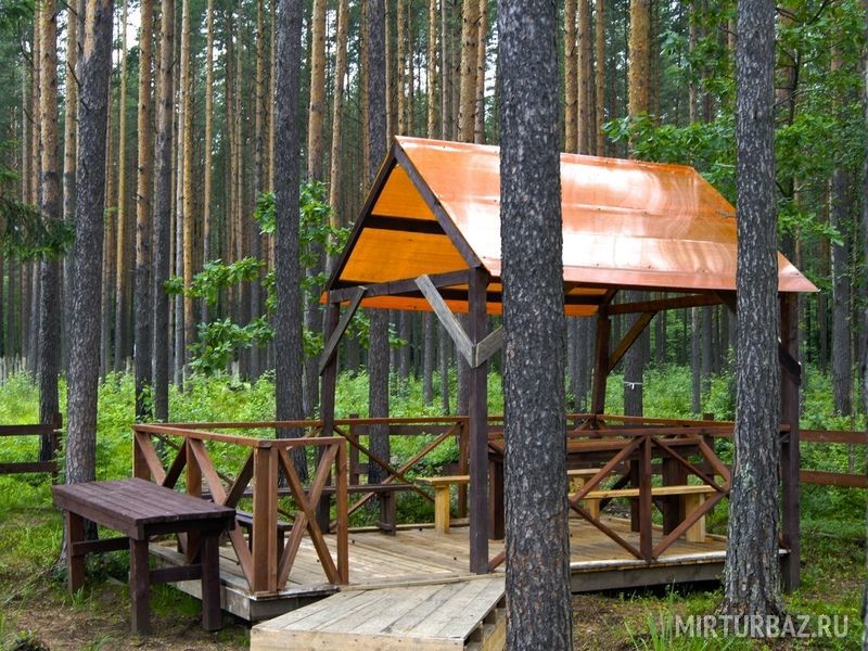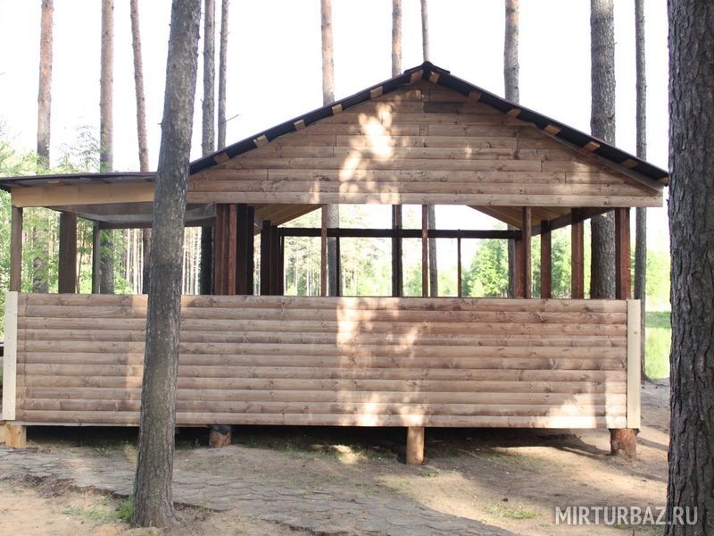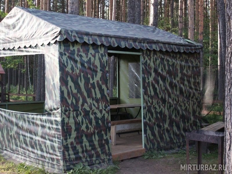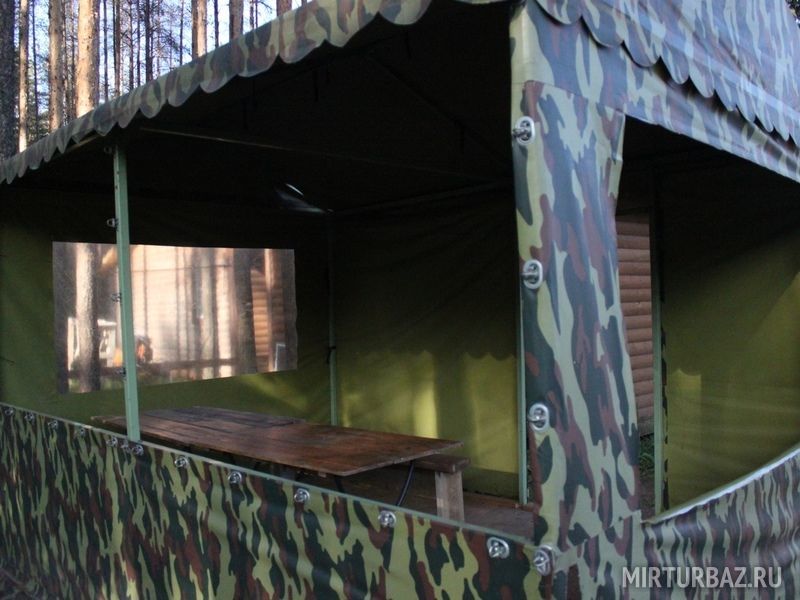 Есть как открытые деревянные беседки с крышей, так и полностью закрывающиеся шатры в стиле милитари. Вместимость беседок – до 20 человек!