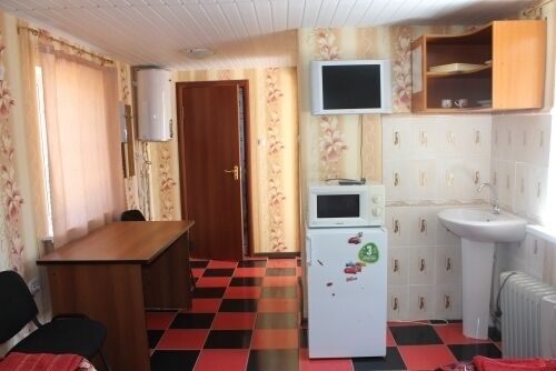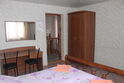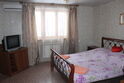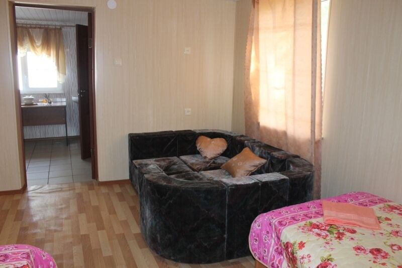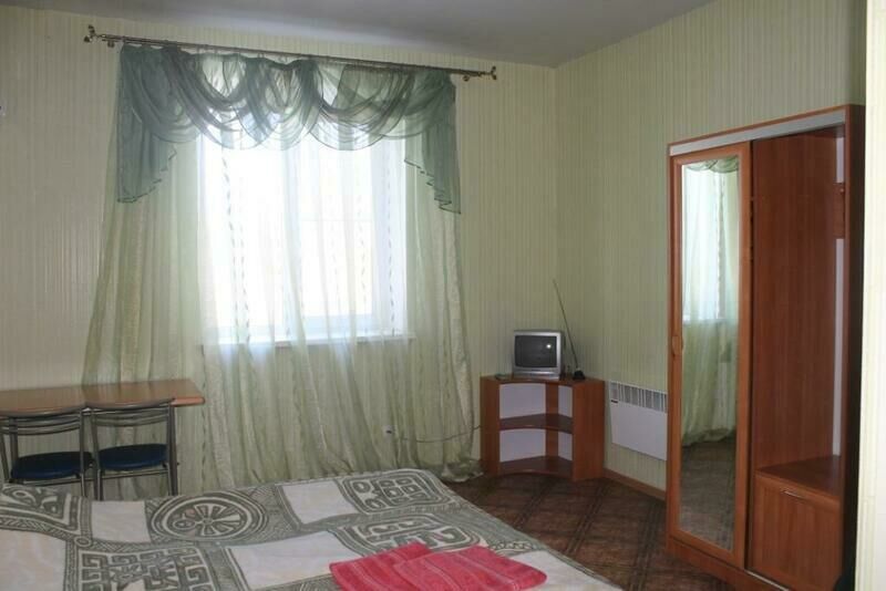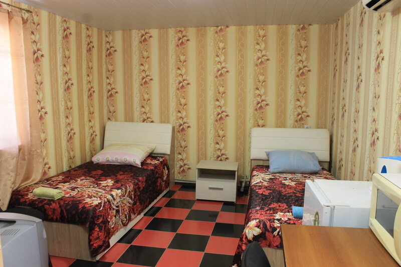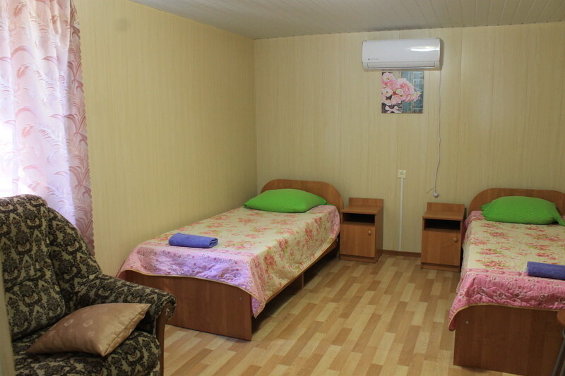 Одноэтажный коттедж на 8 человек. Два выхода. В коттедже 2 раздельные 2-х местные спальни (в каждой половине дома). В каждом номере сплит система, туалет, душ, телевизор, электрическая плитка,посуда, электрочайник, холодильник, кухня. В спальнях 2-х спальные кровати и раскладные диваны.